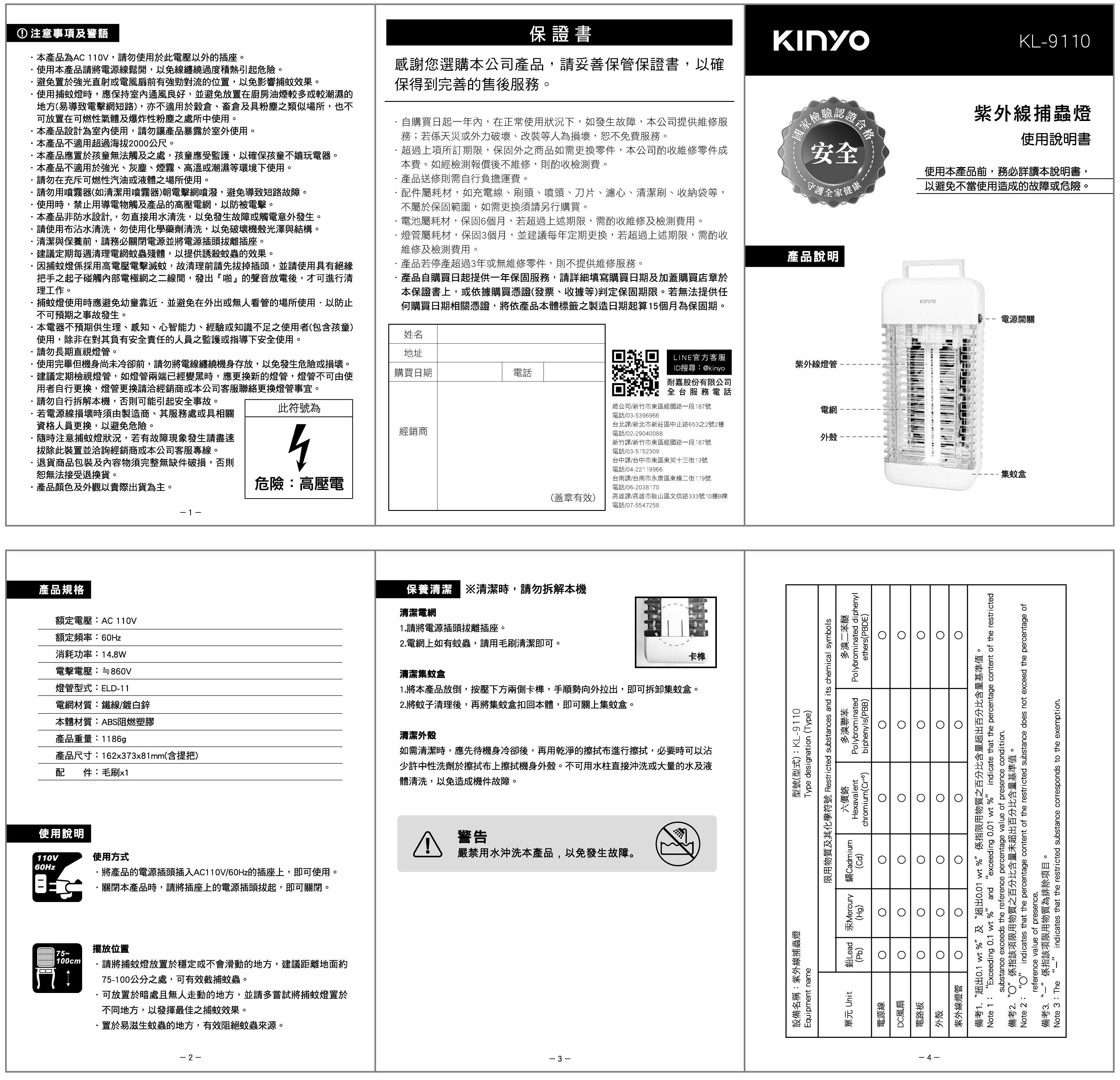額定電壓:AC 110V 額定頻率:60Hz 消耗功率:14.8W 電擊電壓:≒860V 本體材質:ABS阻燃塑料 電網材質:鐵線/鍍白鋅 燈管型號:ELD-11 適用光源:紫外線燈管11Wx1 配件:毛刷x1 產品尺寸: W162xH373xD81 mm(含提把) 產品重量: 1186 g 包裝尺寸: W185xH345xD87 mm 包裝重量: 1315 g