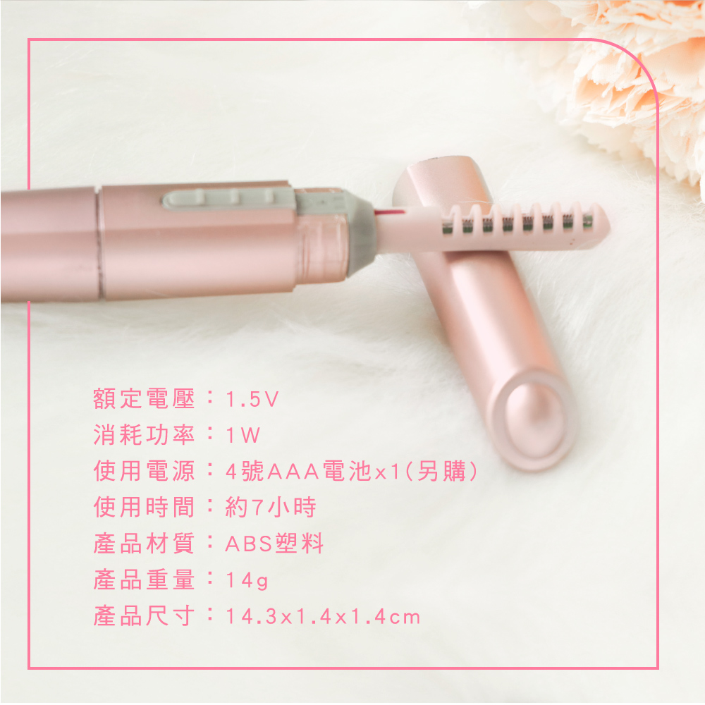 使用方法 1.打開開關指示燈亮起,預熱約1分鐘。 2.貼近睫毛根部。 3.順著睫毛輕輕按壓保持約3~5秒。 4.使用後請關閉開關。