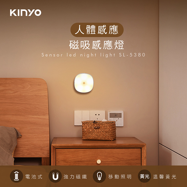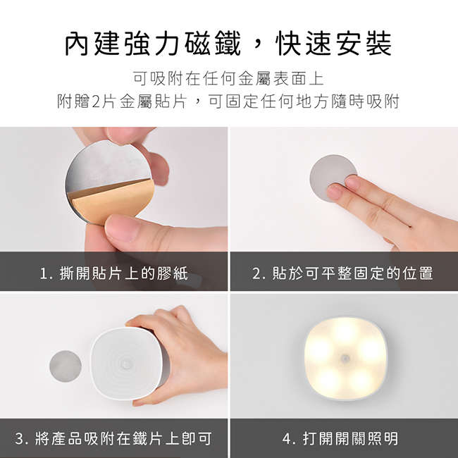 額定電壓:DC 4.5V 額定電流:58mA 總額定消耗電功率:0.22W 使用電源:4號AAA電池x3 (另購) 光源:LED 5顆, 0.044W x 1pcs 色溫:3090K 材質:ABS塑膠 配件:磁吸片x2 產品尺寸: W86xH87xD29 mm 產品重量: 65 g