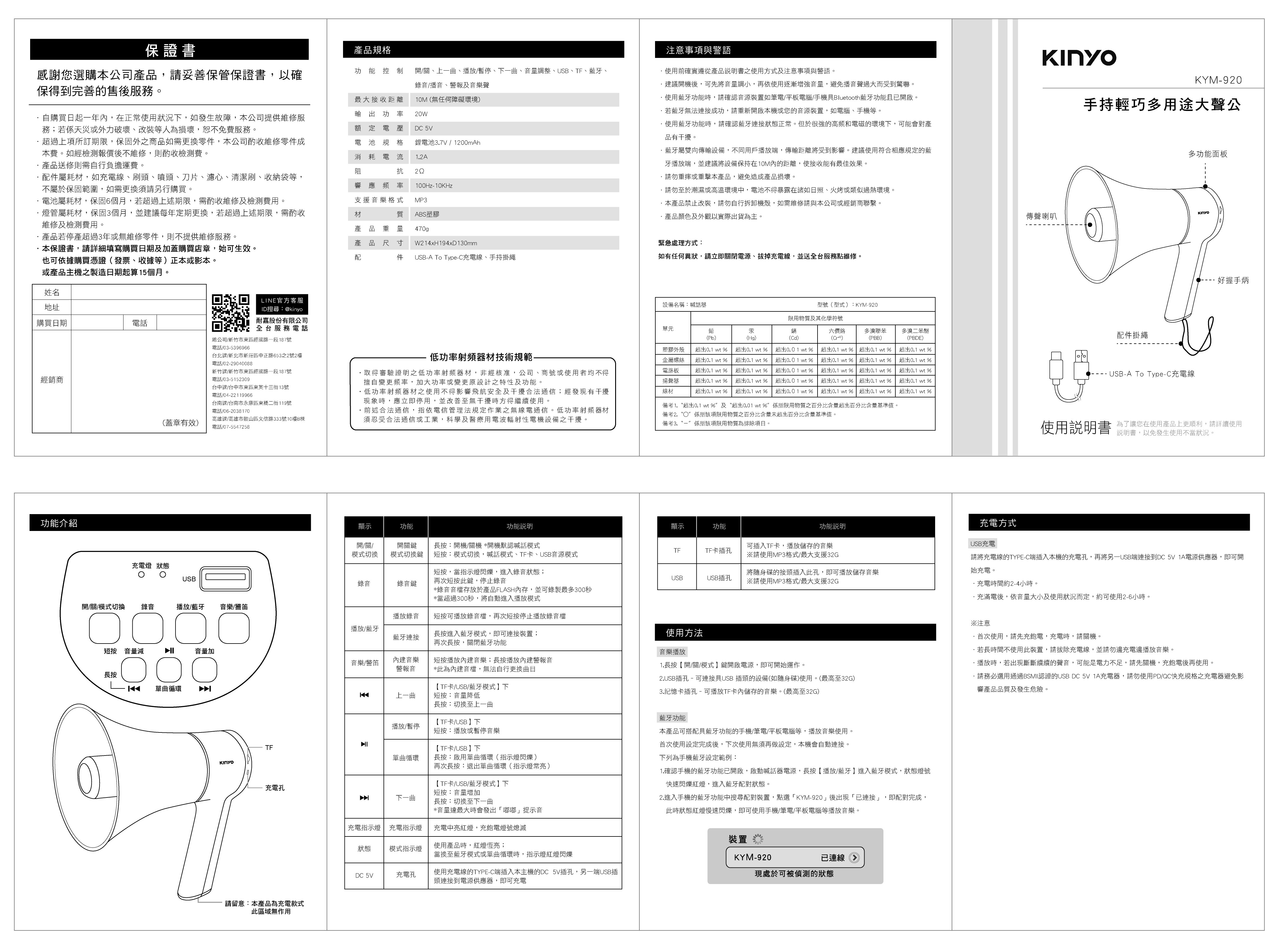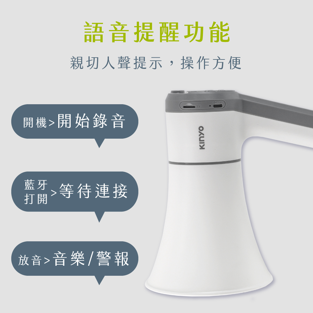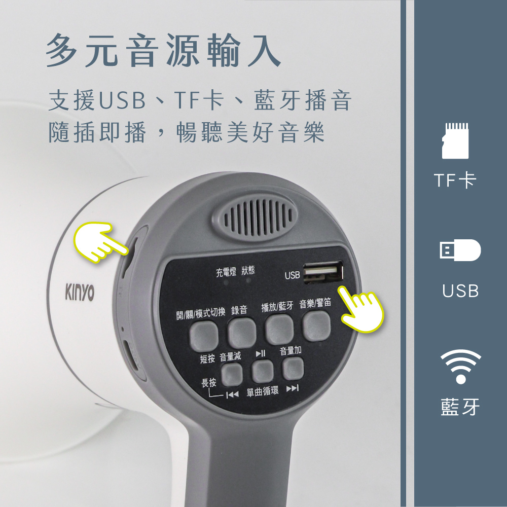 功能控制:開/關、上一曲、播放/暫停、下一曲、音量調整、USB、TF、藍牙、錄音/播音、警報及音樂聲