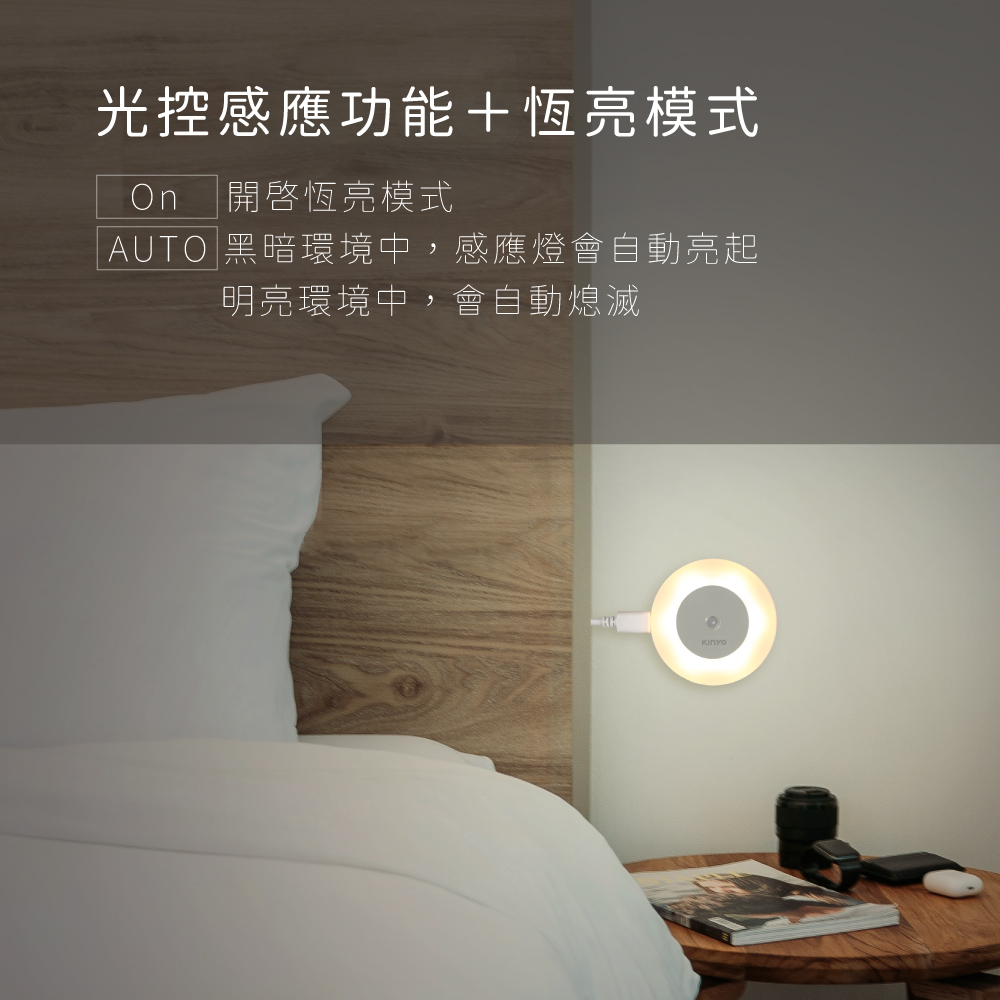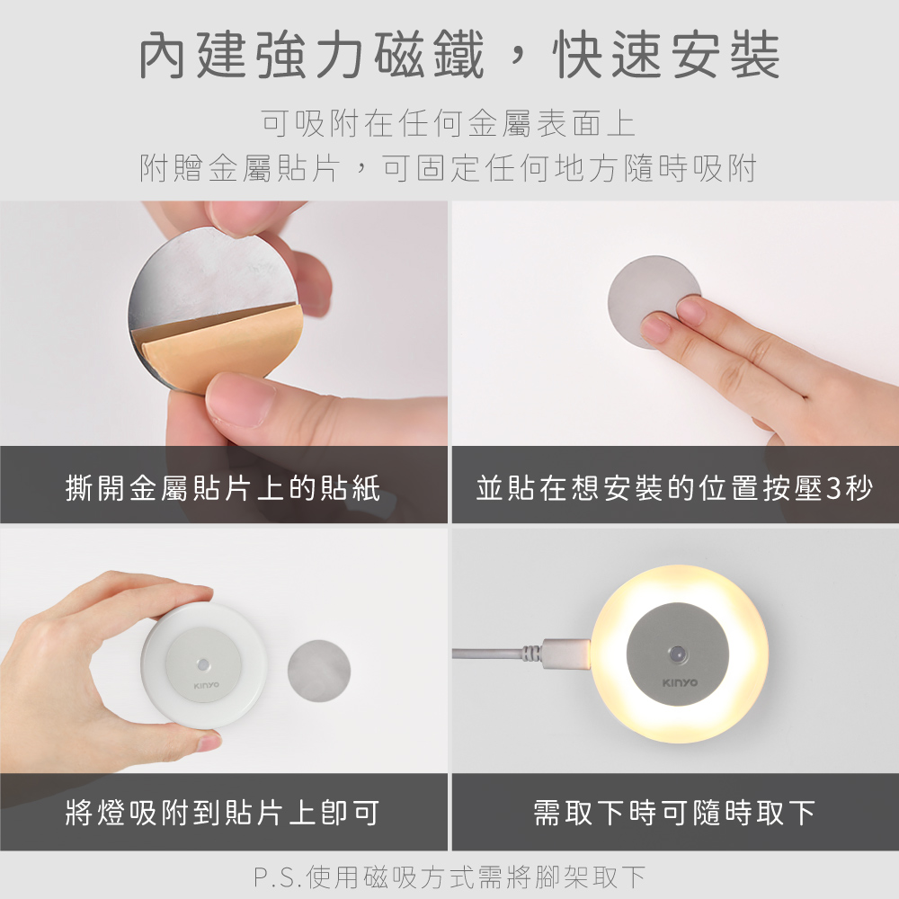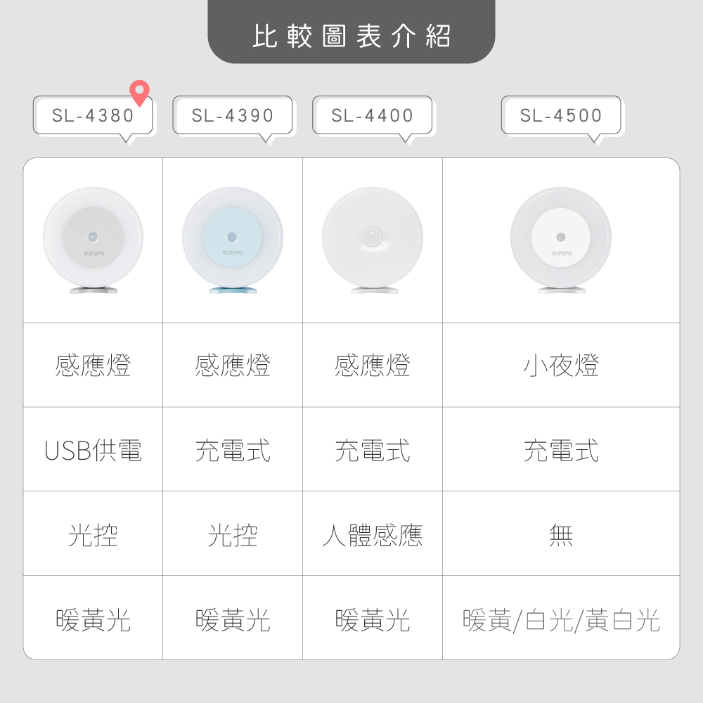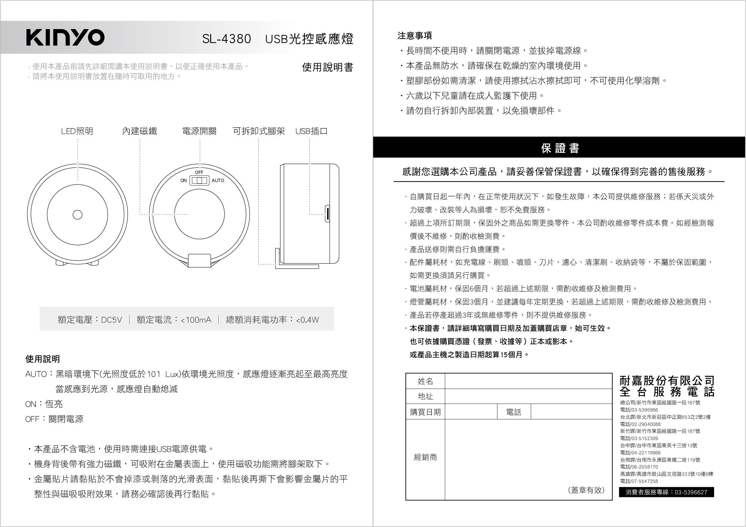 品名:USB 光控感應燈 型號:SL-4380 額定電壓:DC5V 額定電流:<100mA 總額消耗電功率:<0.4W 色溫:3000K 光源:SMD LED6顆 材質:ABS+PC塑料 產品重量:49g 包裝重量:17g 產品尺寸:W60xH63xD30mm 包裝尺寸:W170xH100xD33mm 產品配件:磁吸片x1、USB線x1、腳架x1