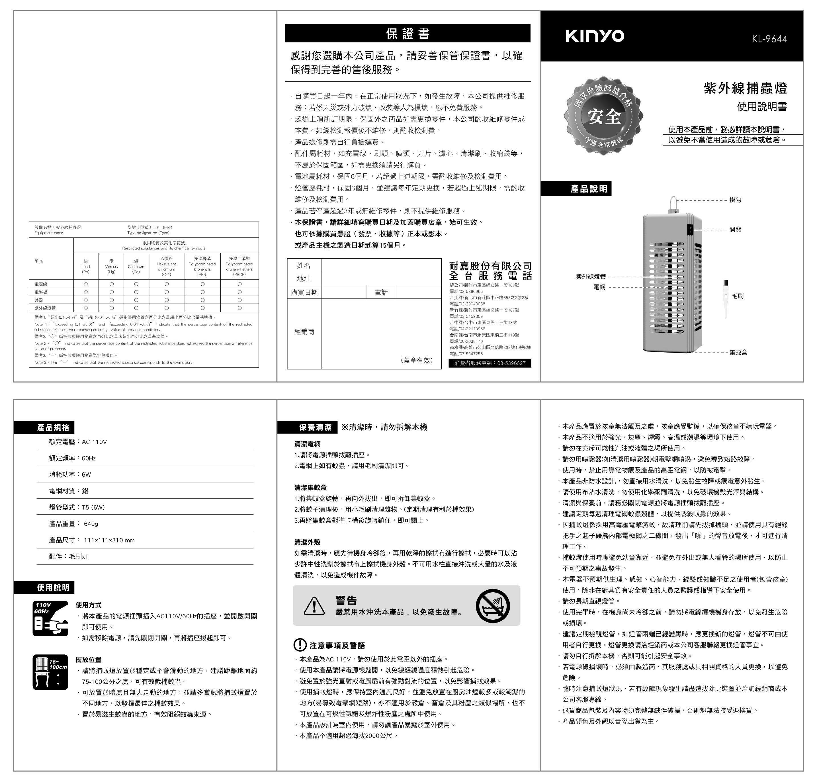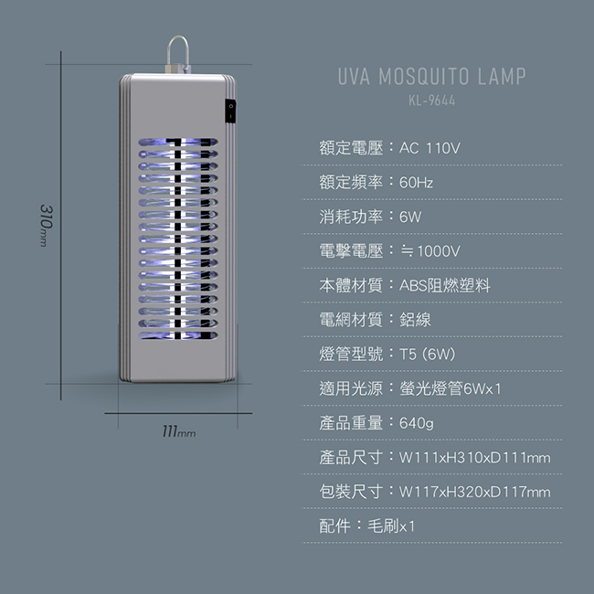 額定電壓:AC 110V 額定頻率:60Hz 消耗功率:6W 電擊電壓:≒1000V 本體材質:ABS阻燃塑料 電網材質:鋁線 燈管型號:T5 (6W) 適用光源:螢光燈管6Wx1 配件:毛刷x1 產品尺寸: W111xH310xD111 mm 產品重量: 640 g 包裝尺寸: W117xH320xD117 mm 包裝重量: 810 g