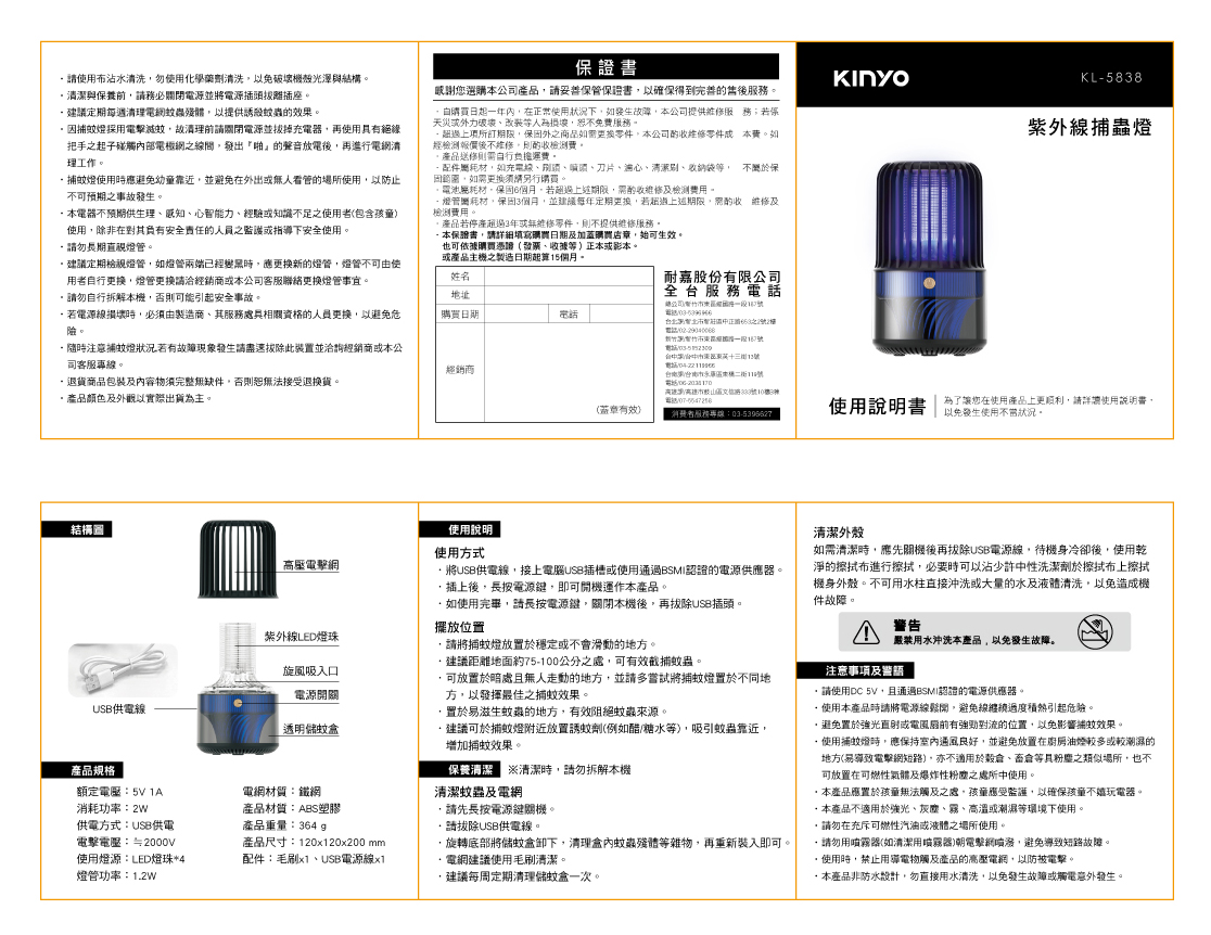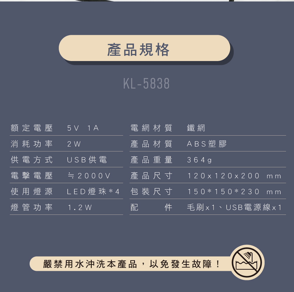 額定電壓:5V 1A 消耗功率:2W 供電方式:USB供電 電擊電壓:≒2000V 使用燈源:LED燈珠*4 燈管功率:1.2W 電網材質:鐵網 產品材質:ABS塑膠 產品重量:364 g 產品尺寸:120x120x200 mm 包裝尺寸:150*150*230 mm 配件:毛刷x1、USB電源線x1 產品尺寸: W120xH120xD200 mm 產品重量: 364 g
