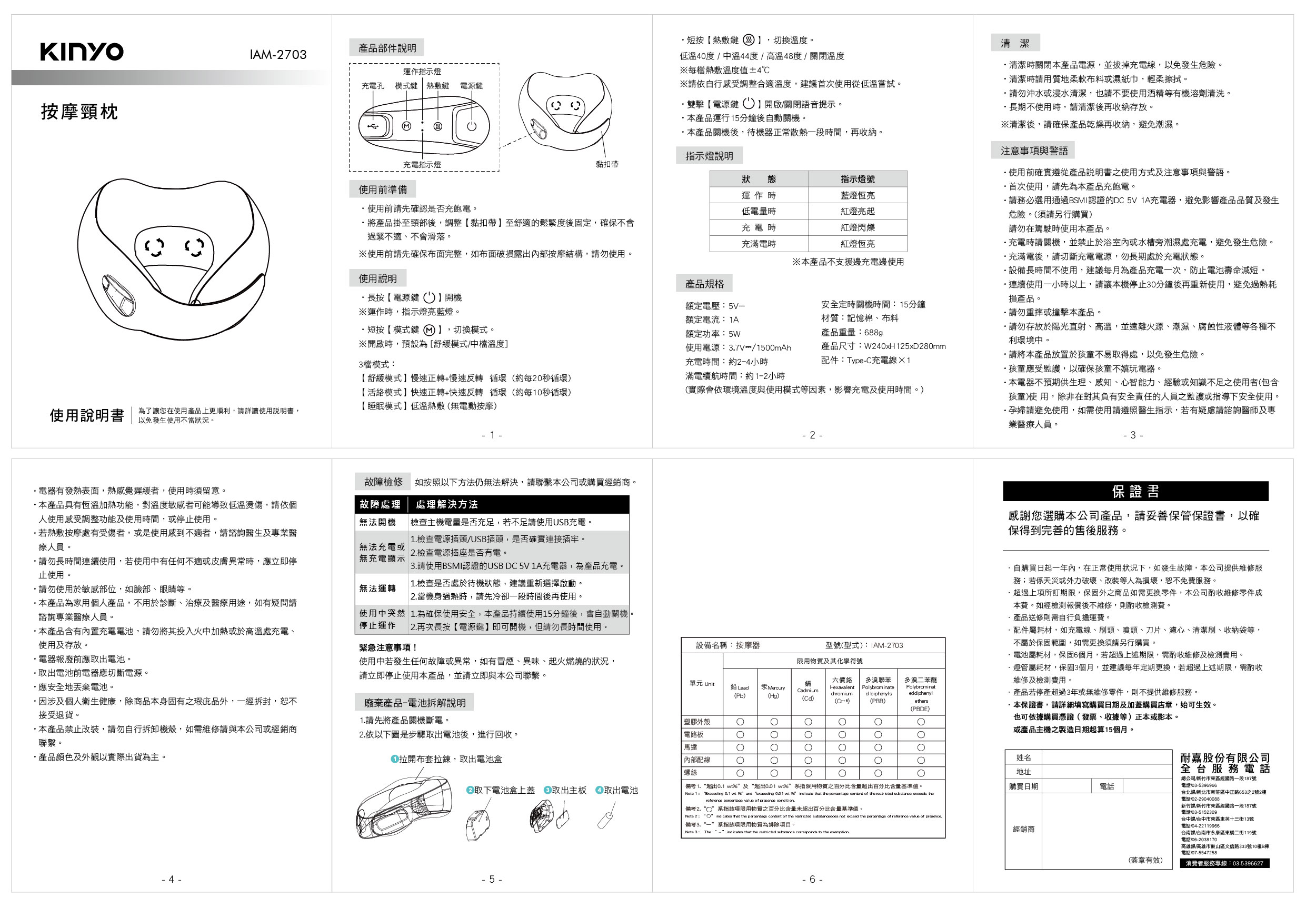 額定電壓:5V⎓ 額定電流:1A 額定功率:5W 使用電源:3.7V⎓/1500mAh 充電時間:約2-4小時 滿電續航時間:約1~2小時 安全定時關機時間:15分鐘 材質:記憶棉、布料 配件:USB充電線×1 產品尺寸: W240xH125xD280 mm 產品重量: 688 g 包裝尺寸: W245xH290xD125 mm