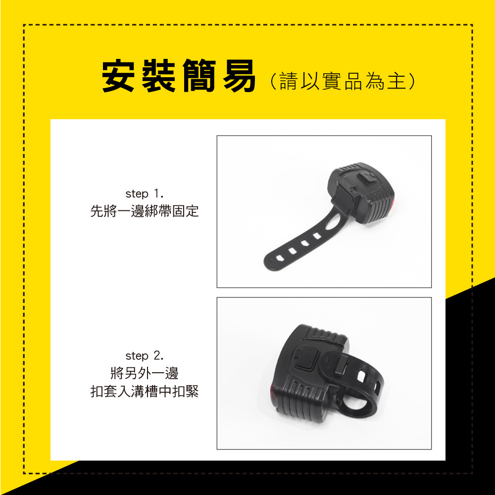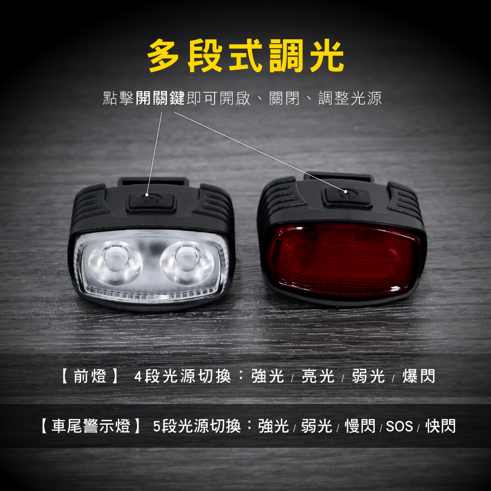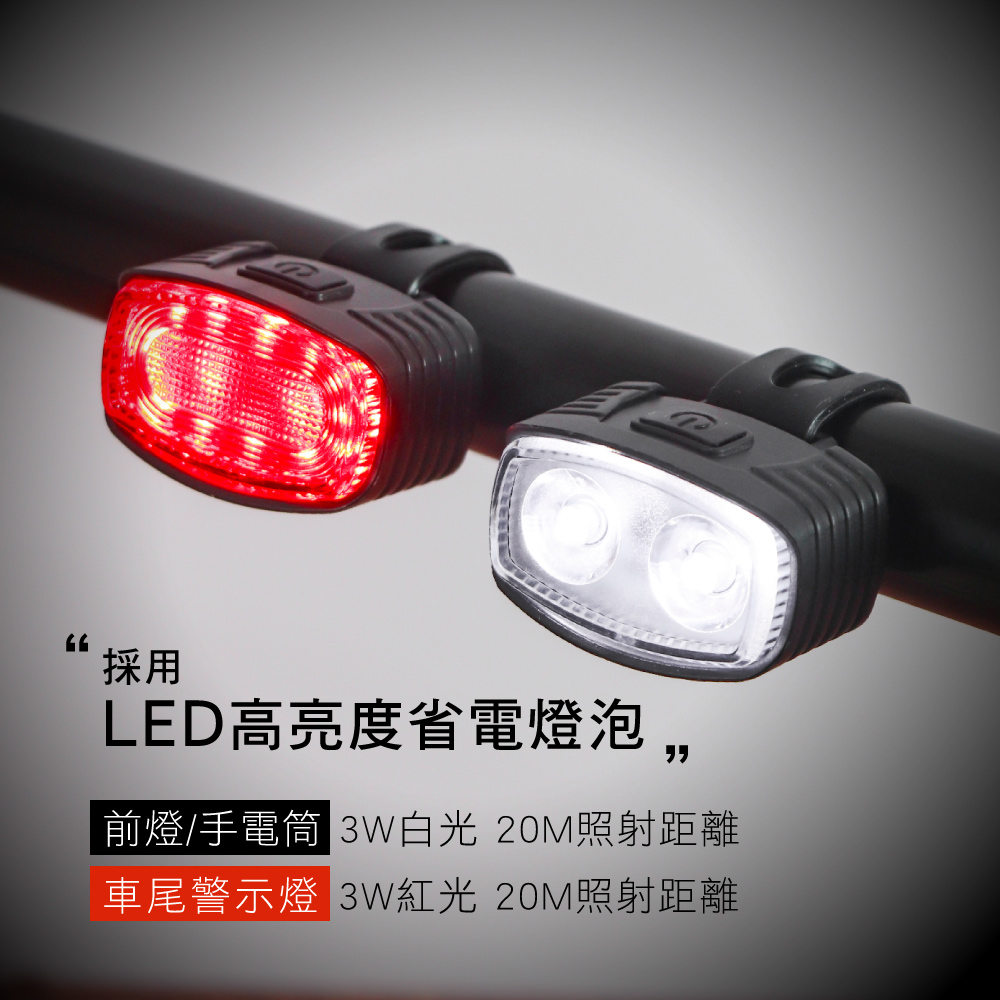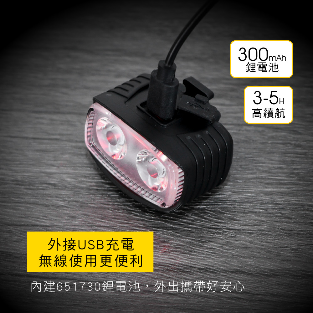 使用電源:內建651730鋰電池300mAh 額定電壓:3.7V⎓0.8A 消耗功率:3W 充電時間:約2-3小時 連續使用時間:約3-5小時 使用光源:LED 亮度:(前燈)80流明、(尾燈)5流明 照射距離:20m 防水等級:IP22 指示燈:充電時紅燈閃爍/充飽電紅燈恆亮 材質:ABS塑膠 產品重量:(前燈)24g、(尾燈)22g 配件:USB充電線、綁帶 產品尺寸: W47xH30xD33 mm 包裝尺寸: WxHxD mm 包裝重量: 88g