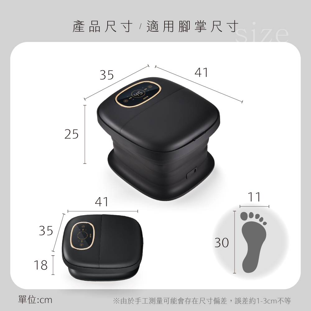 額定電壓:AC 110V 額定頻率:60HZ 額定消耗功率:505W 溫度範圍:35-48℃(±3℃) 最大裝水量:(MAX) 10 L 最小裝水量:(MIN) 5 L 材質:PP塑膠+TPE塑膠 產品尺寸: 展開-W350xH250xD410mm 摺疊-W350xH180xD410mm 產品重量: 2500 g 包裝尺寸: W365xH425xD185 mm
