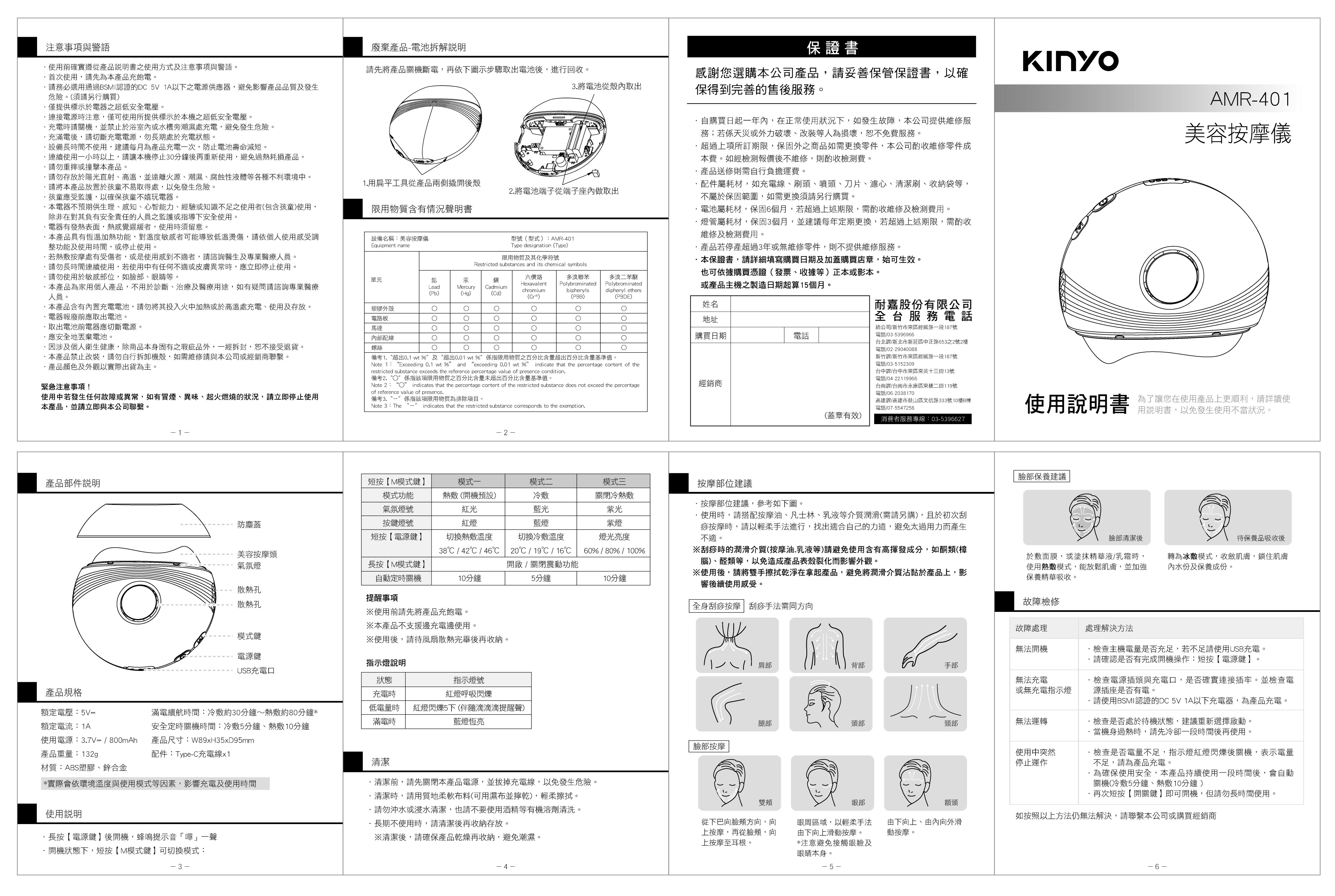 額定電壓:5V? 額定電流:1A 額定功率:5W 使用電源:3.7V?/800mAh 滿電續航時間: 冷敷約30分鐘 ~ 熱敷約80分鐘* *實際會依環境溫度與使用模式等因素,影響充電及使用時間 安全定時關機時間:冷敷5分鐘、熱敷10分鐘 材質: ABS塑膠 配件:Type-C充電線×1 產品尺寸: W89xH35xD95 mm 產品重量: 132 g 包裝尺寸: W118xH156xD45 mm