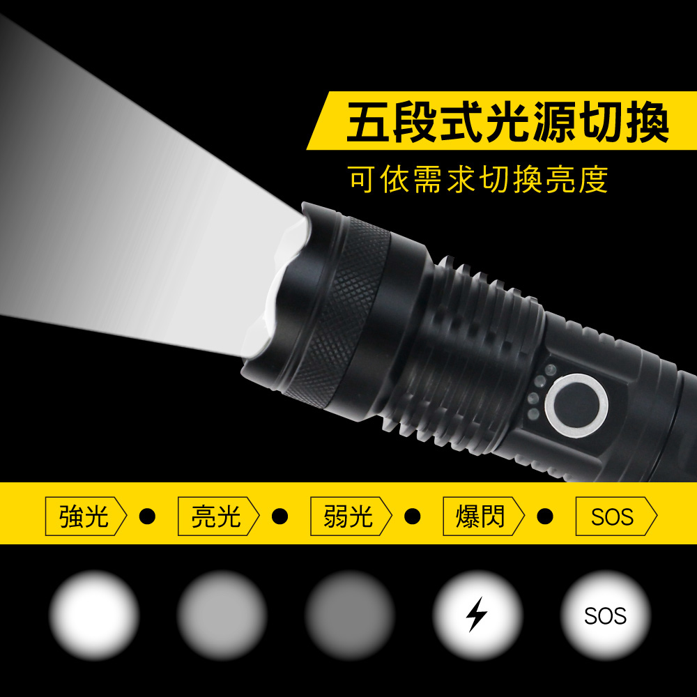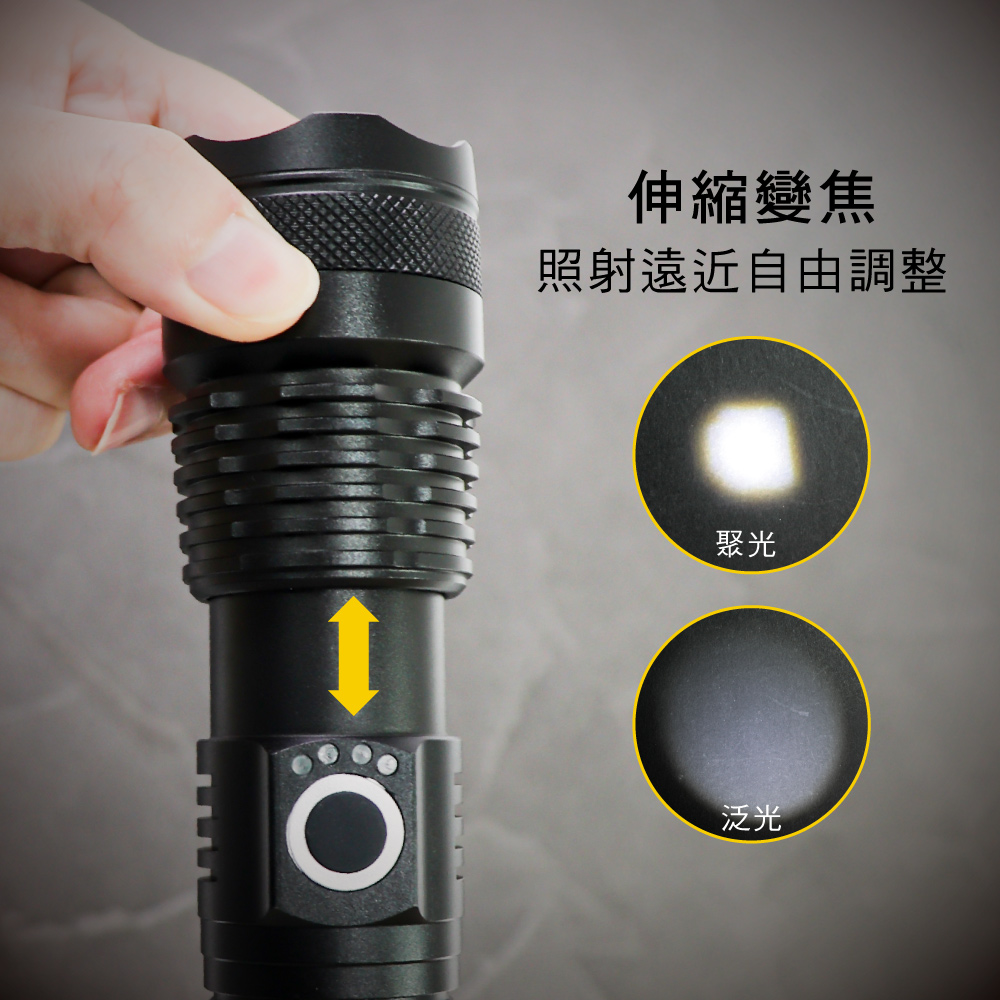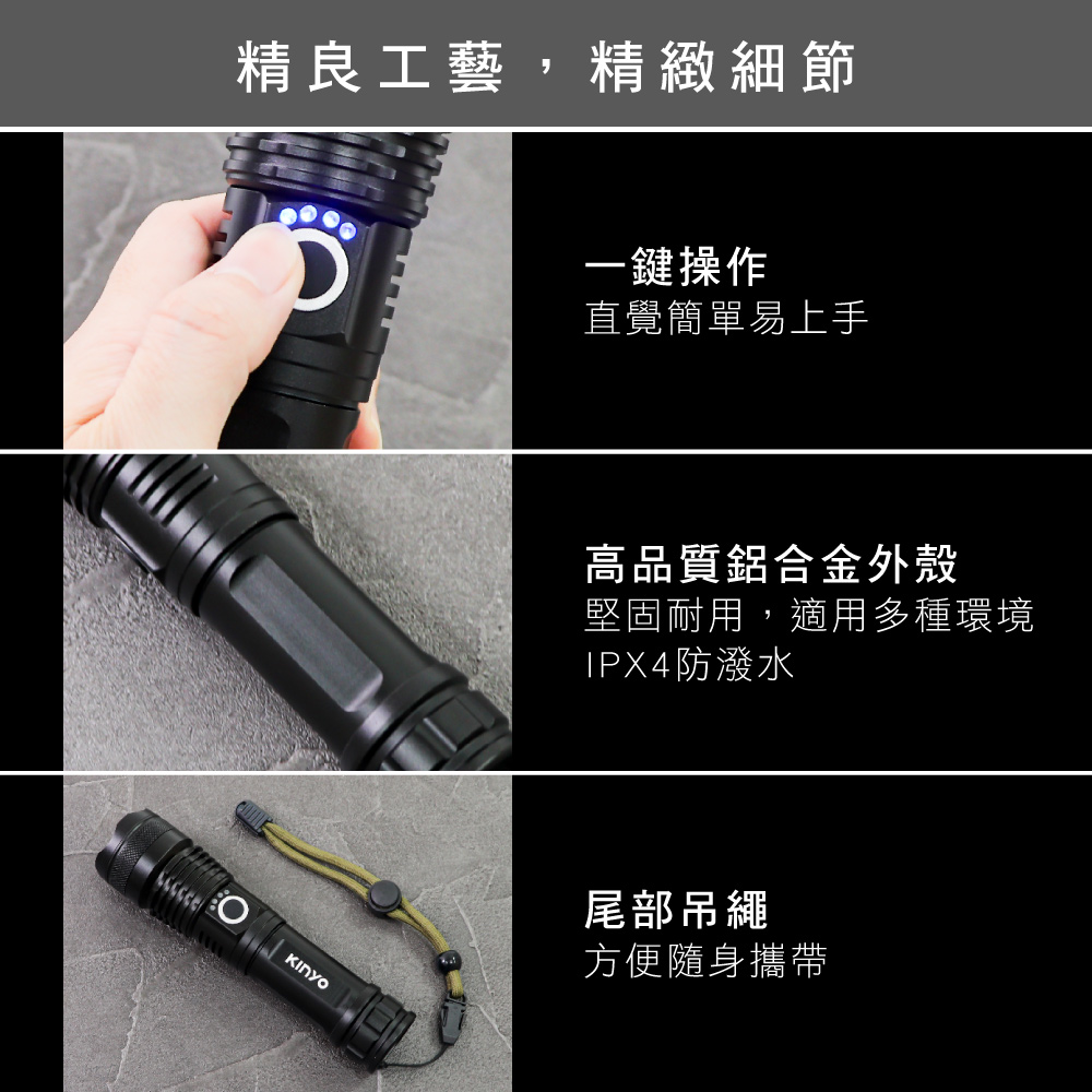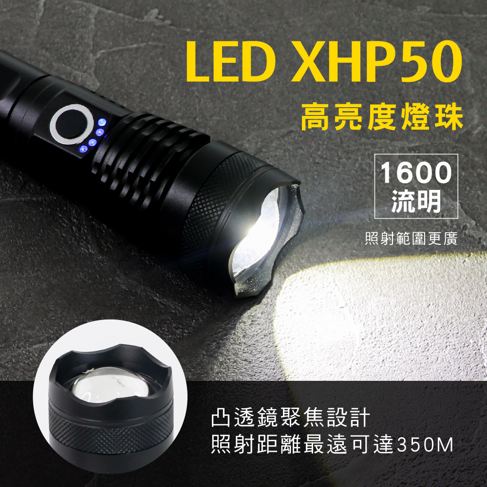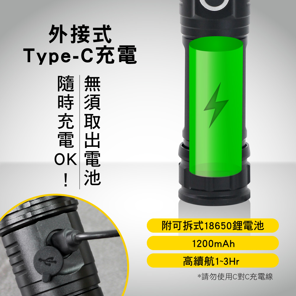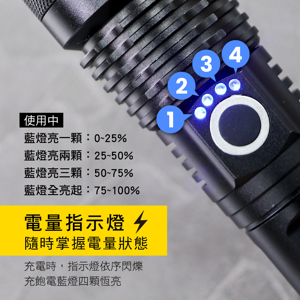 額定充電電壓/電流:DC 5V⎓1A 電池規格:可拆式18650鋰電池1200mAh 總額消耗電功率:10W 充電時間:約3~4小時 使用時間:約1~3小時 照射距離:350m 使用光源:LED XHP50 亮度:1600流明 指示燈:充電時藍燈依序閃爍/充飽電藍燈4顆恆亮 防水等級:IPX4 材質:鋁合金 配件:USB充電線x1、電池x1、吊繩x1 產品尺寸: W42xH168xD42 mm 產品重量: 225 g 包裝尺寸: W115xH240xD45 mm