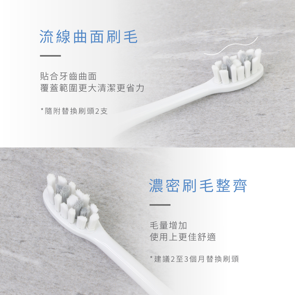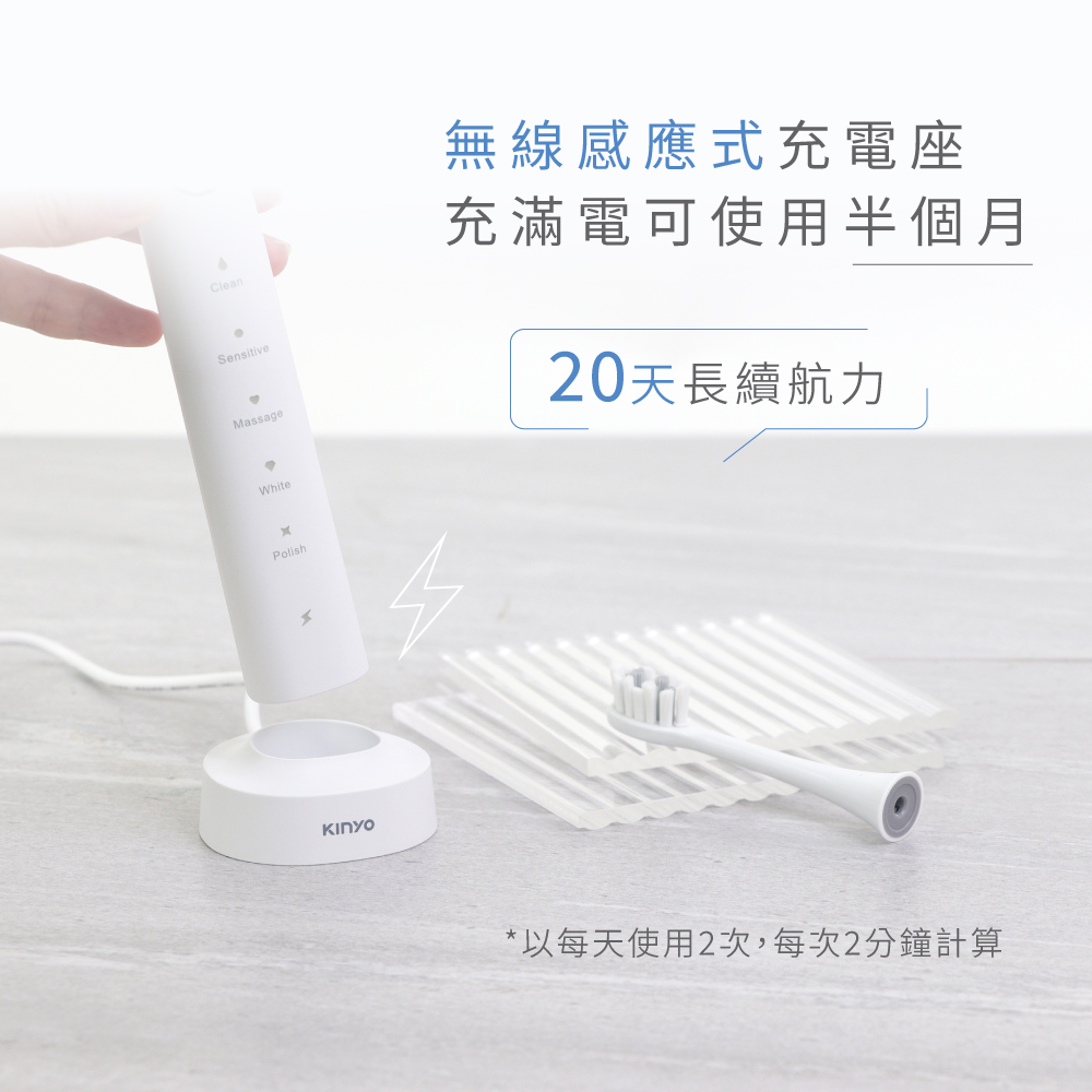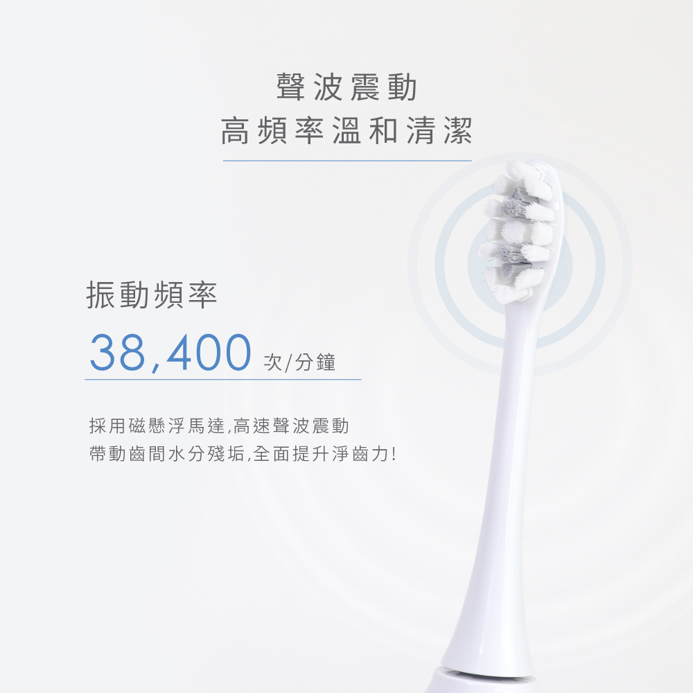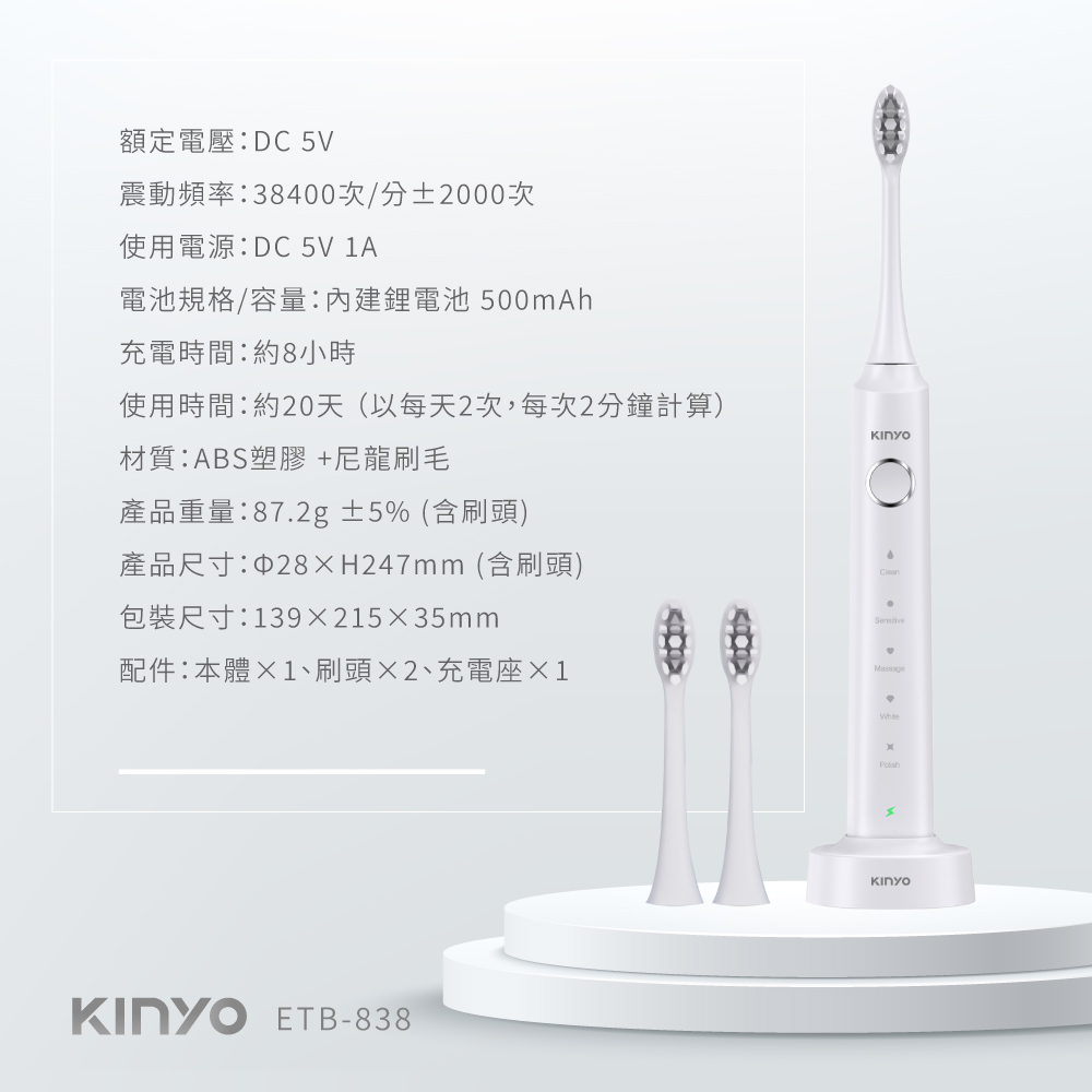 額定電壓:DC 5V 消耗功率:3W 震動頻率:38400次/分±2000次 使用電源:DC 5V 1A 電池規格/容量:內建鋰電池500mAh 充電時間:約8小時 使用時間:約20天(以每天2次/每次2分鐘計算) 材質:ABS塑膠+尼龍刷毛 產品重量:87.2g(含刷頭) 產品尺寸: 247×28×28mm(含刷頭) 54×54×22mm(充電底座) 包裝尺寸:139×215×35mm 配件:本體×1、刷頭×2、充電座×1