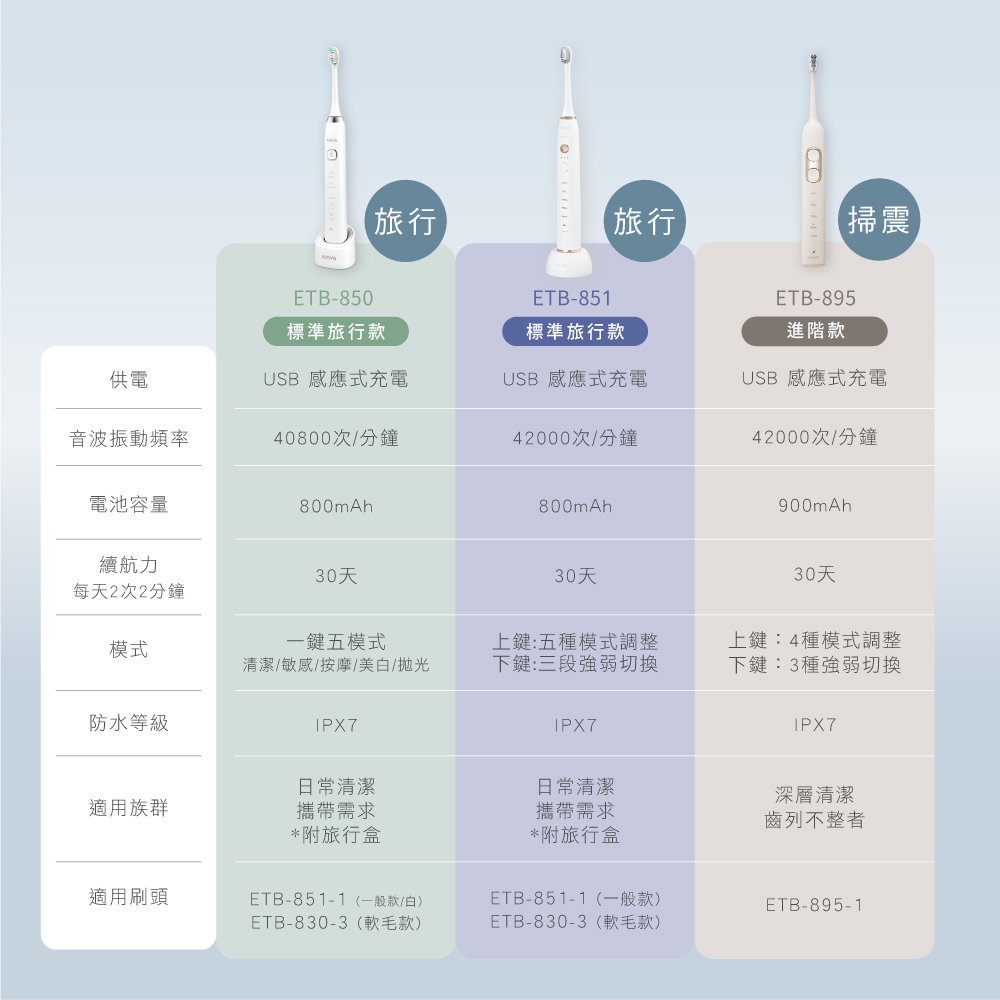 額定電壓:DC 7.4V 消耗功率:5W 震動頻率:42000次/分±2000次 使用電源:DC 5V 1A 產品尺寸:W30×D30×H246mm(含刷頭) 包裝尺寸:W156.3×D43×H358.5mm 配件:牙刷本體×1、刷頭×2、Type-C充電線×1電池規格/容量 內建鋰電池900mAh 充電時間: 約8小時 使用時間:約30天(以每天2次/每次2分鐘計算) 材質:ABS塑膠 產品重量:151g(含刷頭) 商品原產地:中國(SM)
