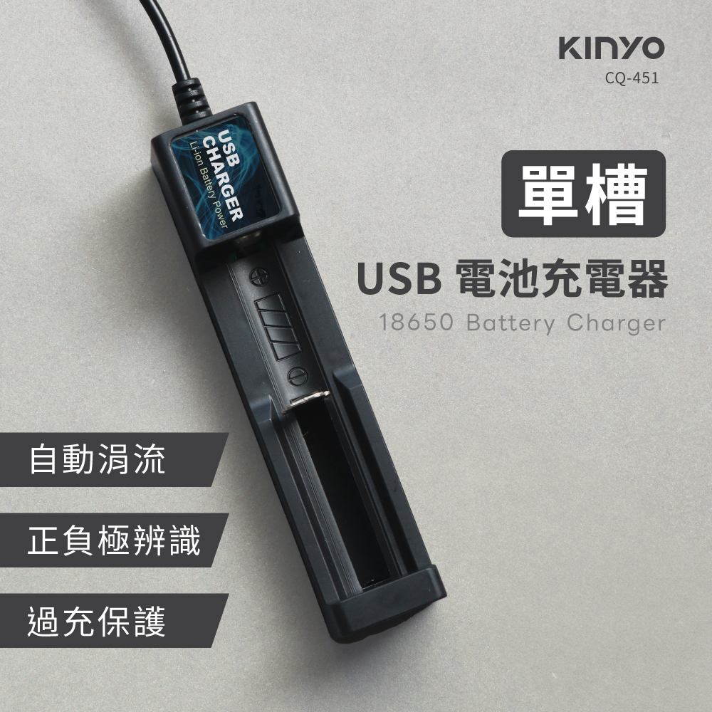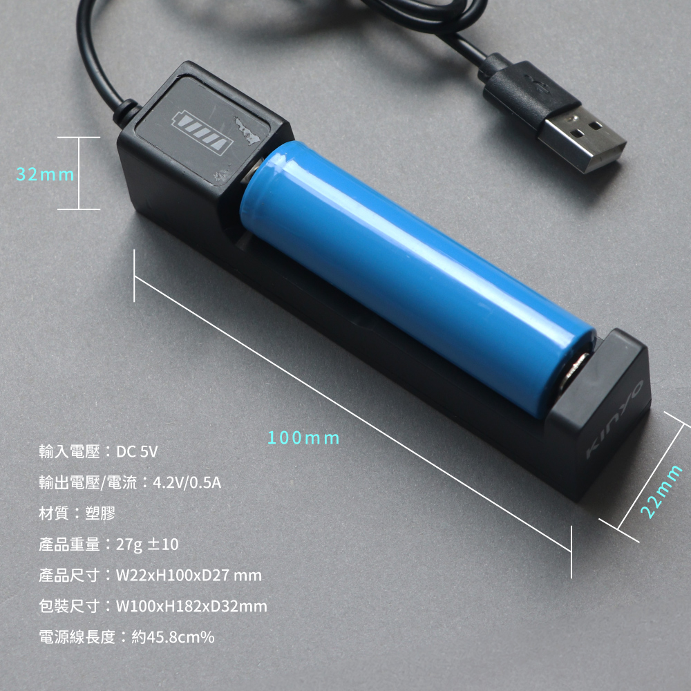 品名:單槽USB鋰電池充電器 型號:CQ-451 輸入電壓:DC 5V 輸出電壓/電流:4.2V/0.5A 材質:塑膠 產品重量:27g ±10% 產品尺寸:W22xH100xD27 mm 包裝尺寸:W100xH182xD32 mm 電源線長度:約45.8cm 產地:中國(HQ)