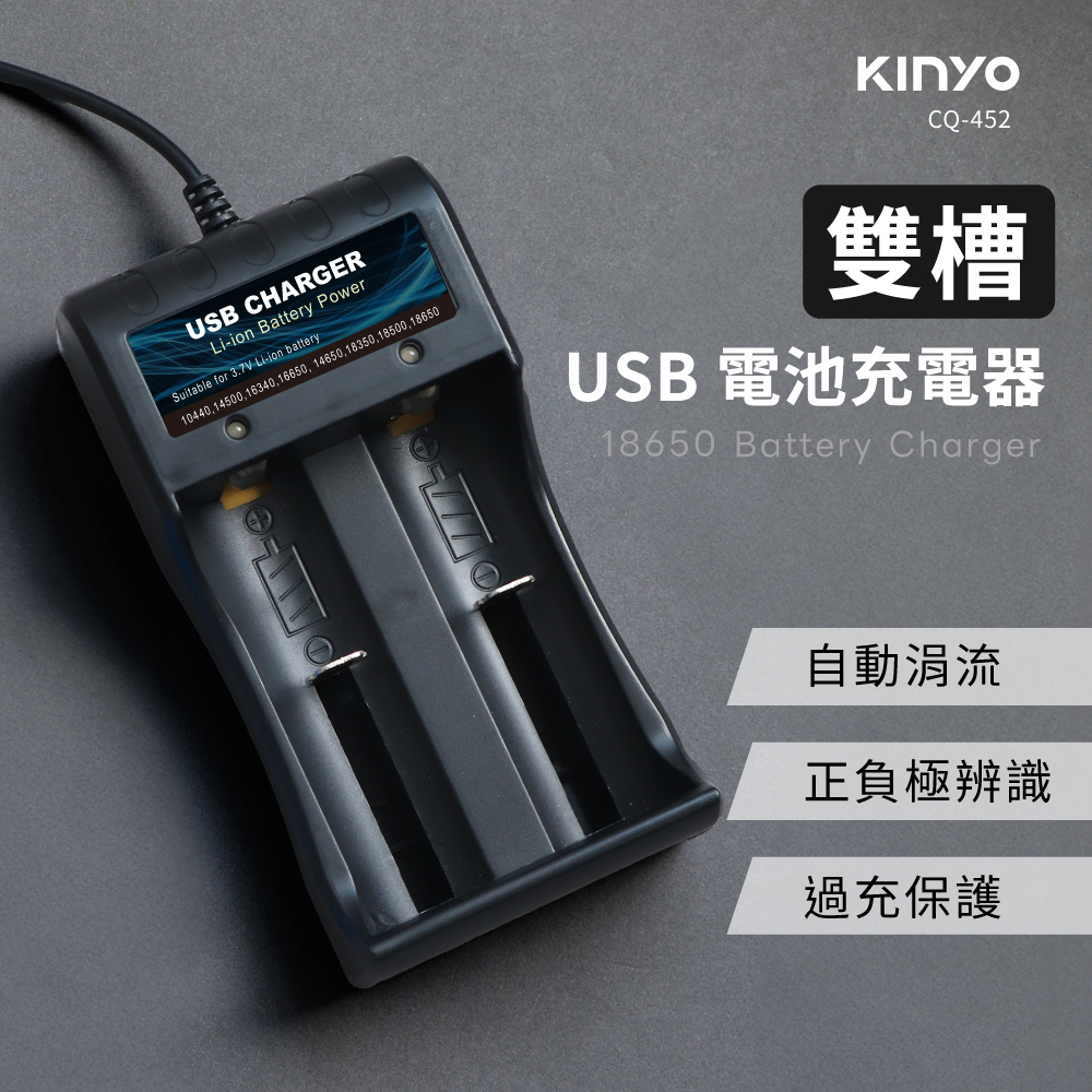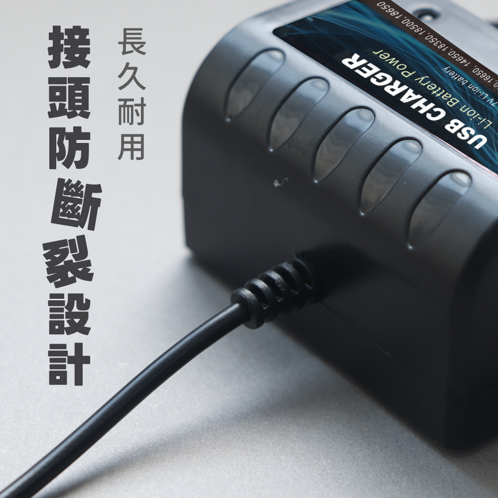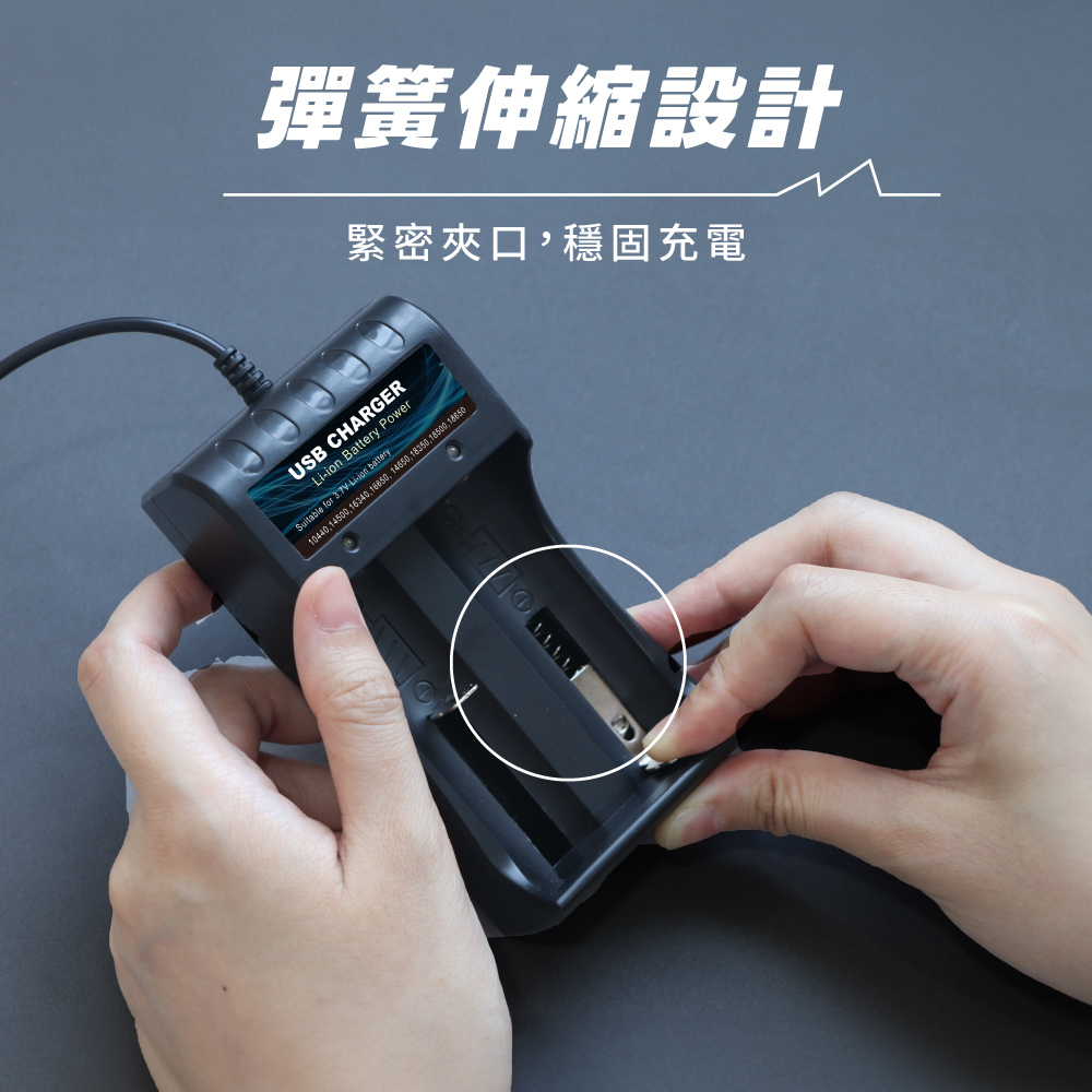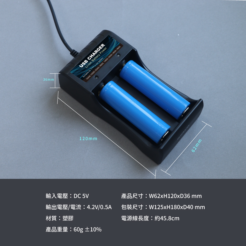 品名:雙槽USB鋰電池充電器 型號:CQ-452 輸入電壓:DC 5V 輸出電壓/電流:4.2V/0.5A 材質:塑膠 產品重量:60g ±10% 產品尺寸:W62xH120xD36 mm 包裝尺寸:W125xH180xD40 mm 電源線長度:約45.8cm 產地:中國(HQ)