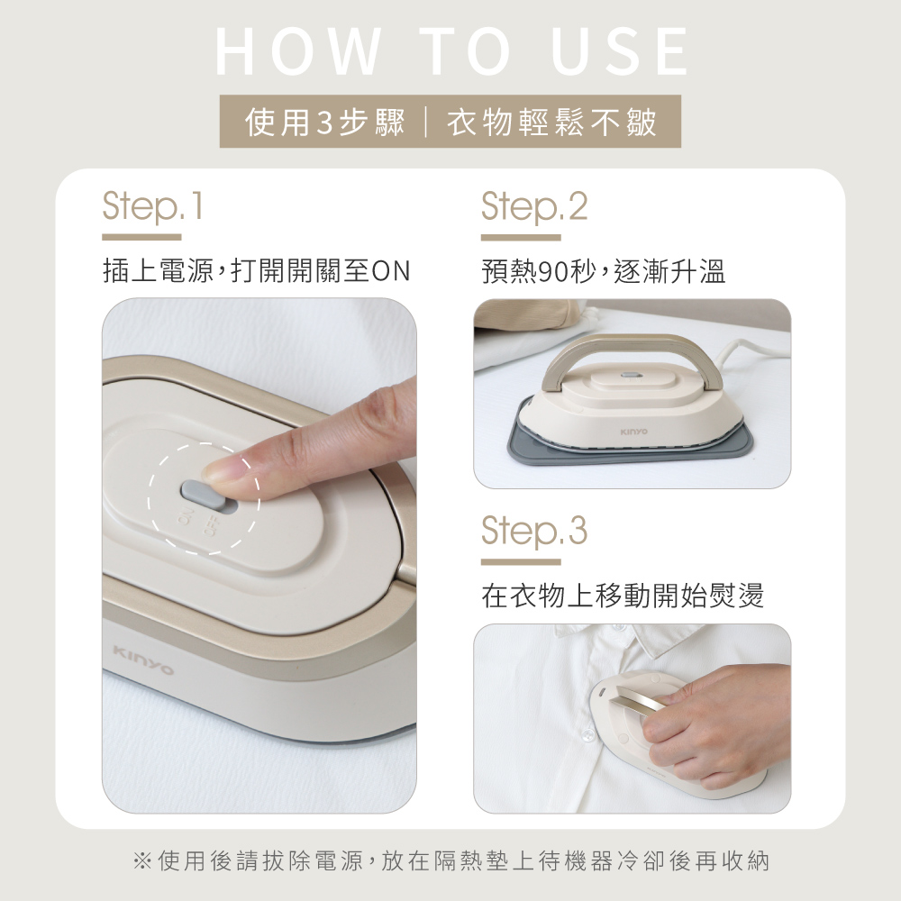 額定電壓:AC100~240V 額定頻率:60Hz 總額消耗電功率:320W 材質:本體PC塑膠、面板鋁+陶瓷塗層、加熱元件 電源線:2m±10cm 產品重量:385g 產品尺寸:W78xH34xD152mm 包裝尺寸:W100xH180xD100mm 產品配件:隔熱底墊x1、噴霧瓶x1、收納袋x1