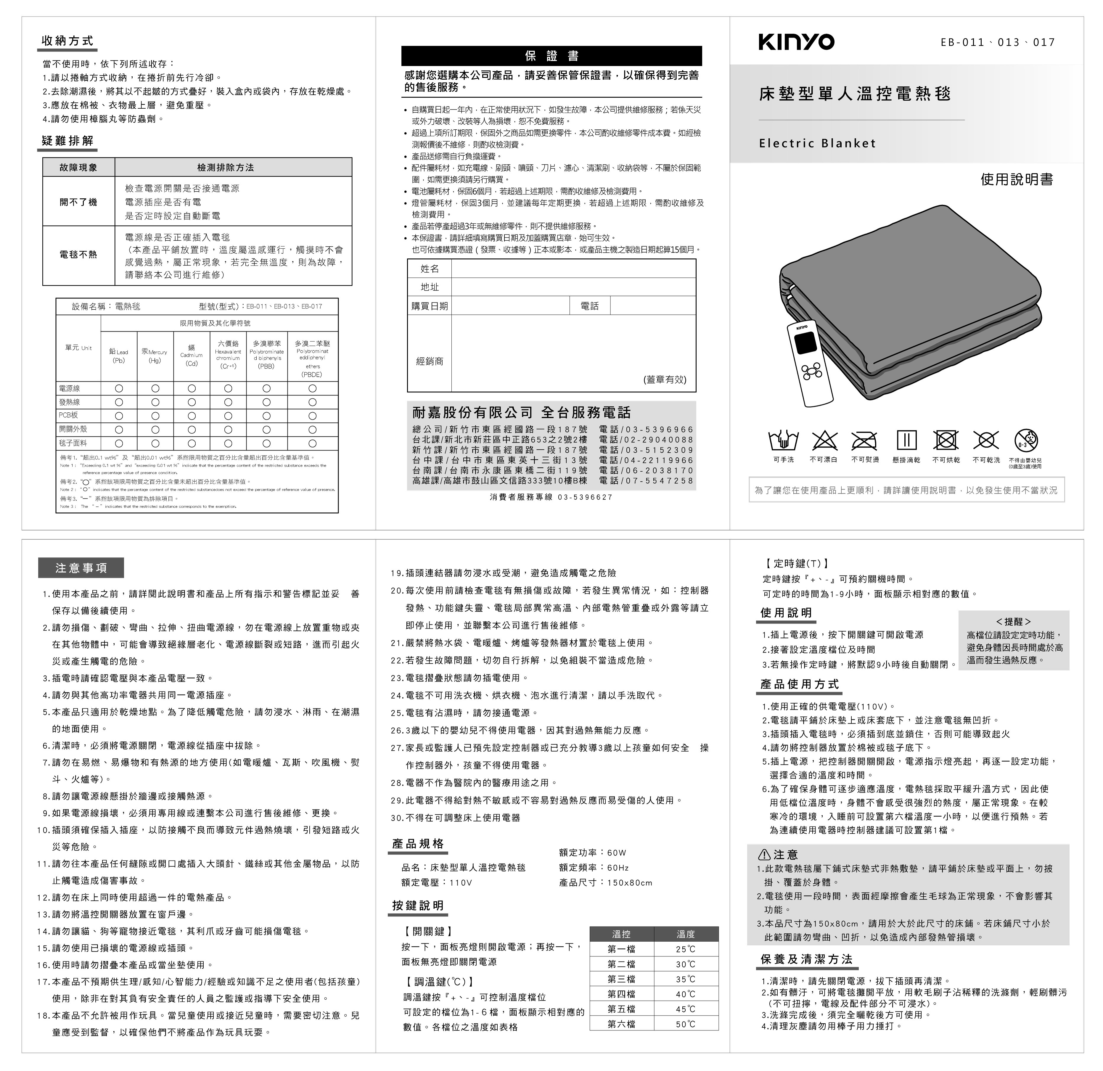 額定電壓:110V 額定頻率:60Hz 總額定消耗電功率:60W 材質:聚酯纖維、電熱元件 布料材質:舒適絨 配件:電源控制器 產品尺寸: W150xHxD80 mm 產品重量: 2750 g 包裝尺寸: W410xH300xD90 mm