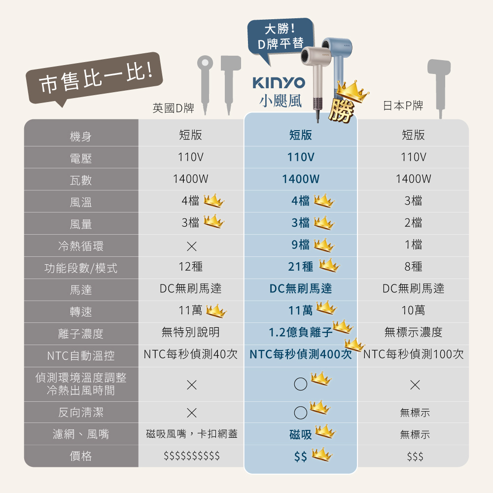 消耗功率:1400W 負離子濃度:1.2億 產品材質:ABS塑膠 額定電壓:AC 110V 額定頻率:60Hz 產品尺寸:105×80×295mm (不含風嘴:Ø68.5×57.5mm) 線長:全長約1.85M、外露約1.8M 包裝尺寸:W150.7×H319.7×D88mm 產品重量:530g(不含風嘴40g) 配件:磁吸風嘴×1