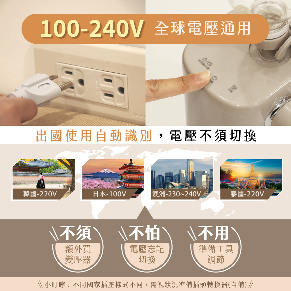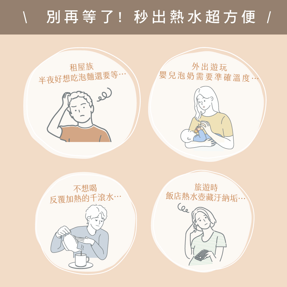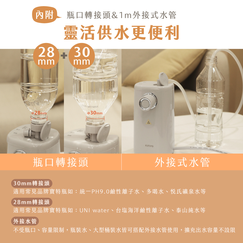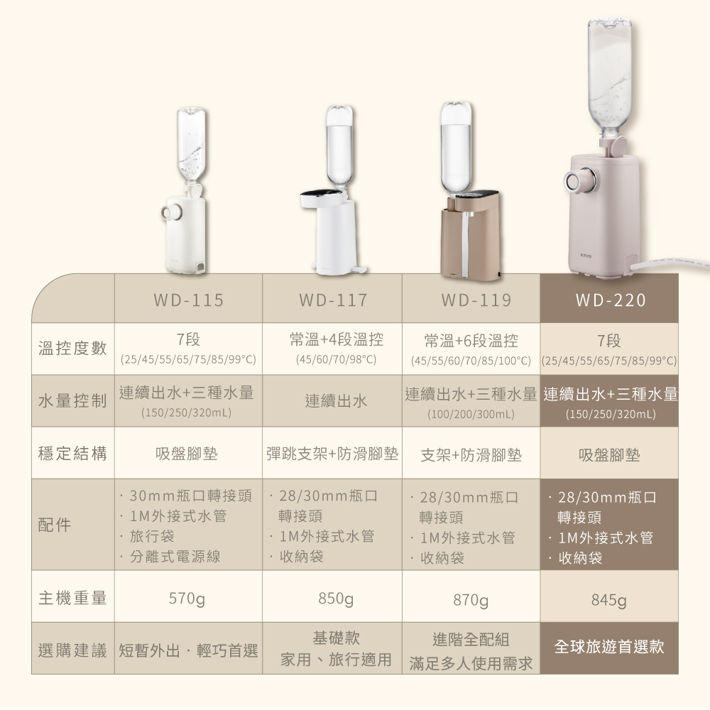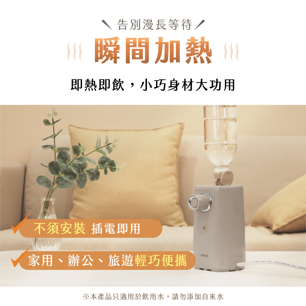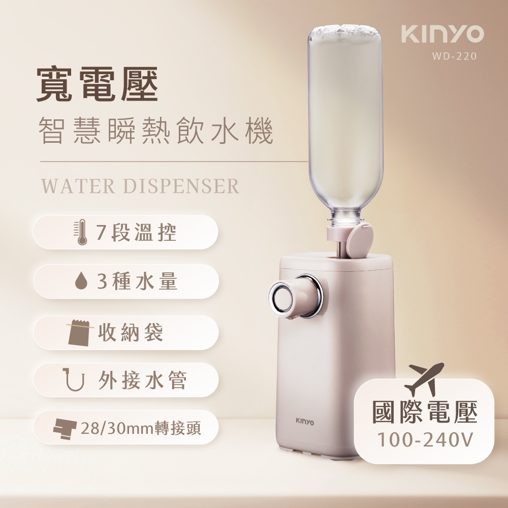 品名:即熱式瞬熱開飲機 型號:WD-220 防水等級:IPX1 額定電壓:100-240V 額定頻率:60Hz 總額定消耗電功率:900W-1070W 配件:28mm瓶口轉接頭、30mm瓶口轉接頭、1M外接式水管、收納袋 產品材質:304不鏽鋼、ABS塑膠、PP塑膠、鋁合金 產品尺寸:W120xD96xH178mm 產品重量:主機845g;含配件885g±10% 包裝尺寸:W165xD145xH220mm 商品原產地:中國(HL)
