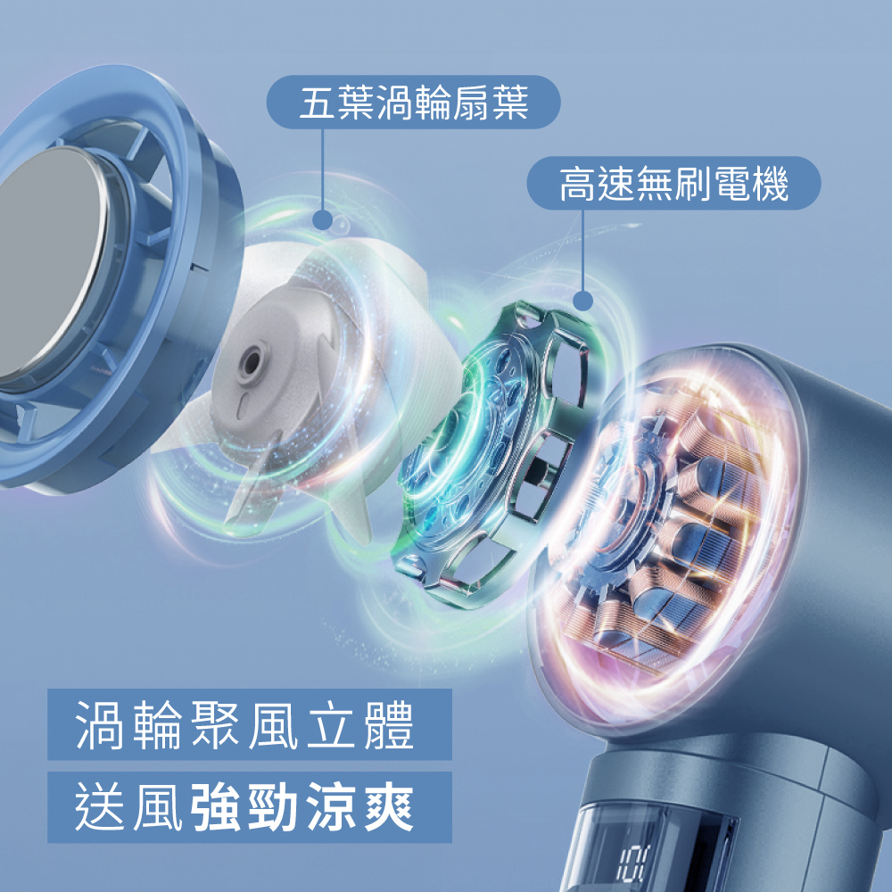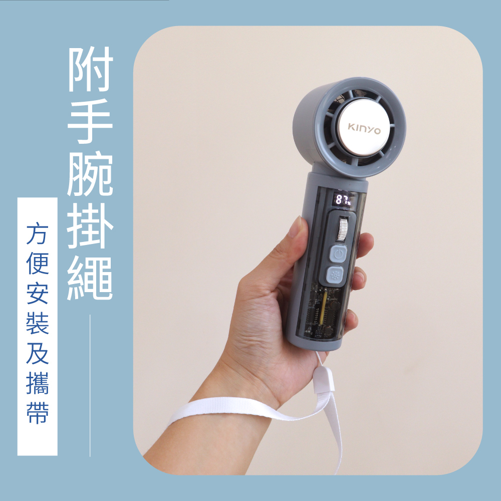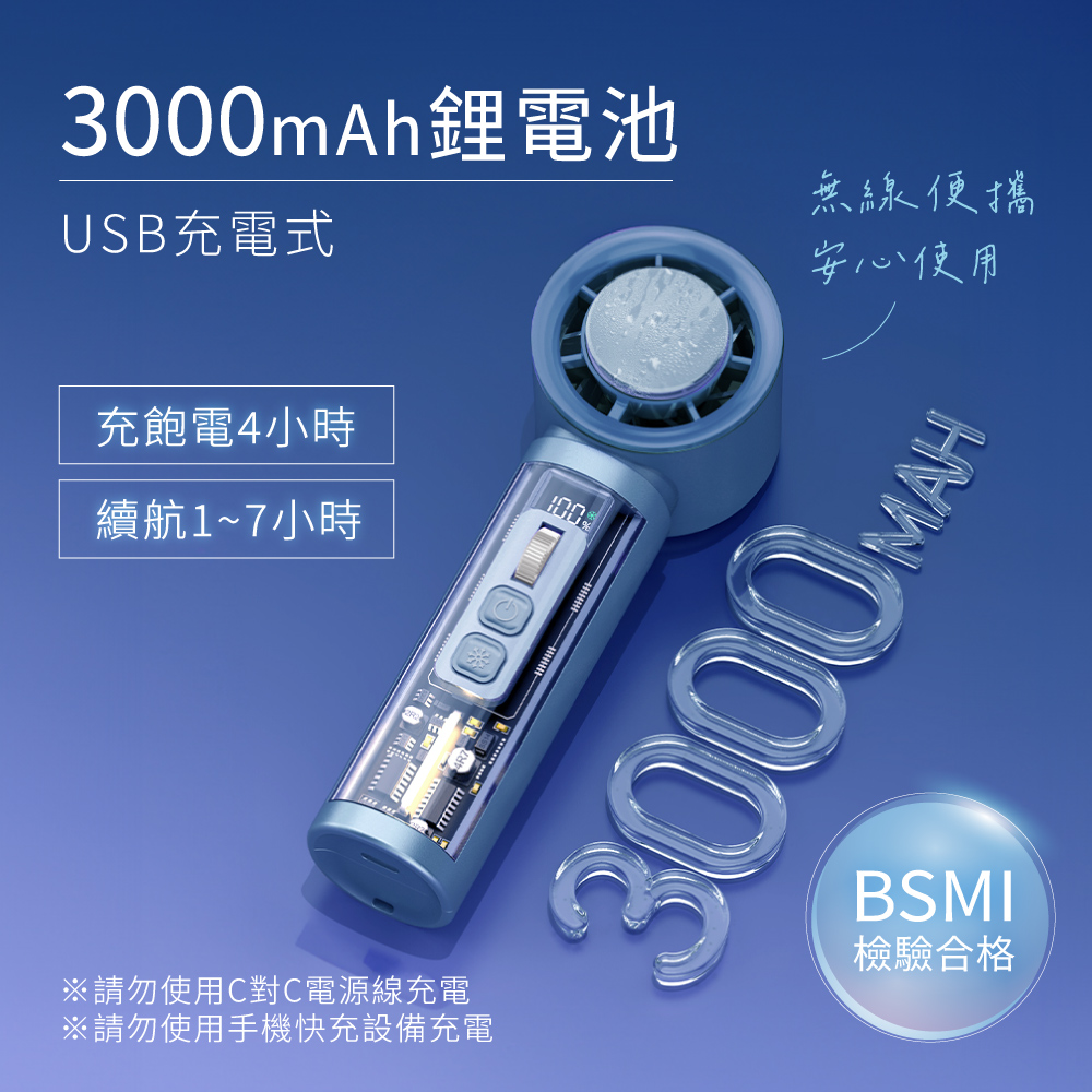 額定充電電壓:DC5V⎓ 額定充電電流:2A 電池規格:內建21700鋰電池3000mAh 充電時間:4小時 使用時間:約1~7小時 充電指示燈: 充電中 顯示當前電量,%閃爍 充飽電 顯示數值100,%恆亮 材質:ABS塑膠+PC塑膠+電子元件 產品重量:210g 產品尺寸:W55xH160xD53mm 包裝尺寸:W72xH182xD59mm 配件:USB To Type C充電線x1、掛繩x1