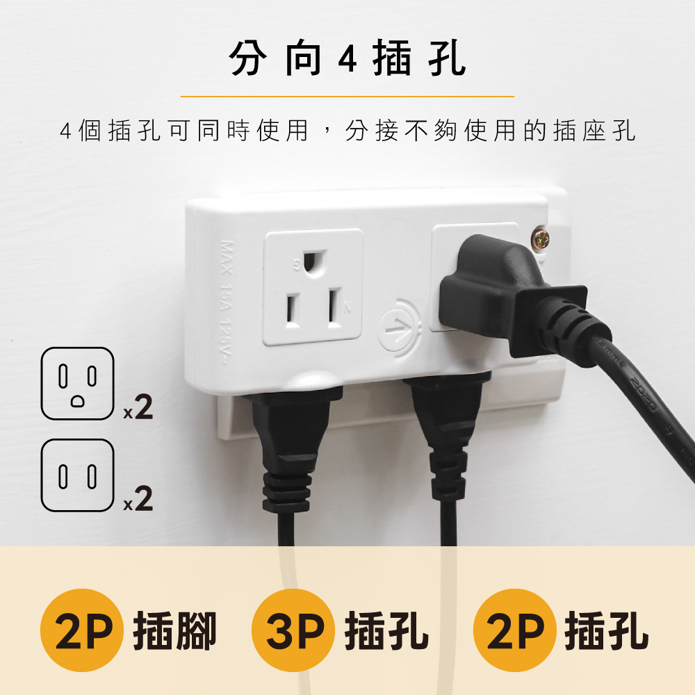 認證型號:A2233 適用電壓:AC110V / 60Hz 2孔插座x2、3孔插座x2 額定電壓:AC 125V 額定電流:15A 額定容量:1650W Max 材質:銅、PC塑膠 產品尺寸: W111xH51xD45 mm 產品重量: 113 g 包裝尺寸: W100xH176xD45 mm