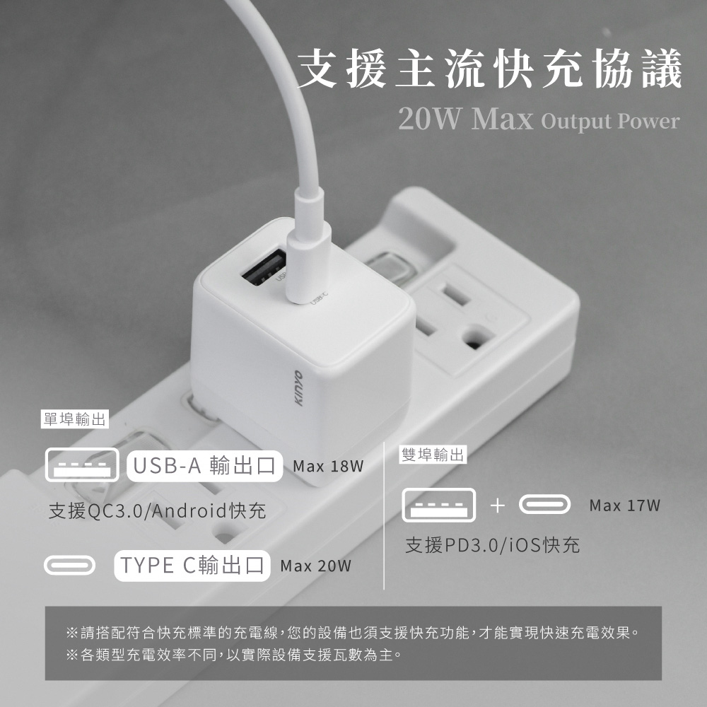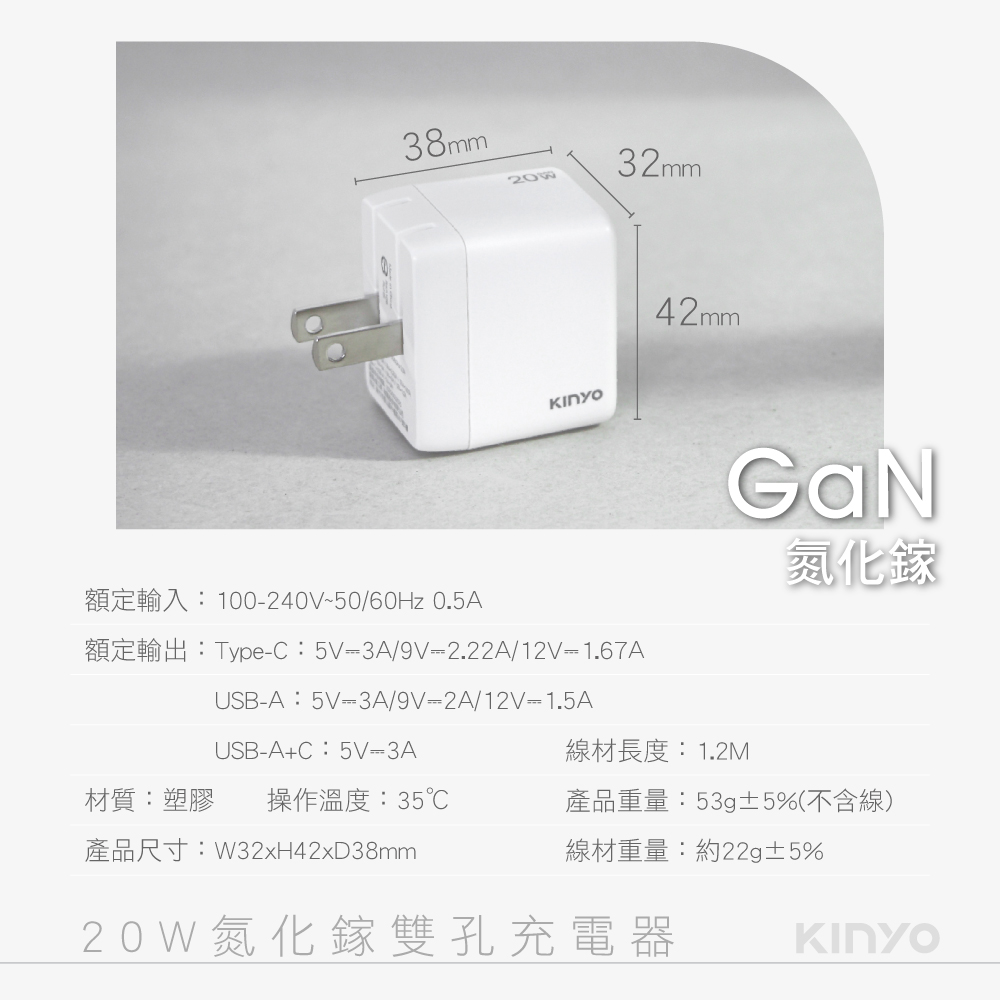 額定輸入:100-240V~50/60Hz 0.5A 額定輸出:Type-C:5V⎓3A/9V⎓2.22A/12V⎓1.67A USB-A:5V⎓3A/9V⎓2A/12V⎓1.5A USB-A+C:5V⎓3A 操作溫度:35℃ 線材長度:1.2M 材質:塑膠 線材重量:約22g±5% 產品重量:53g±5%(不含線) 配件:Type-C To Type-C充電線 產品尺寸: W32xH42xD38 mm 包裝尺寸: W90xH154xD38 mm