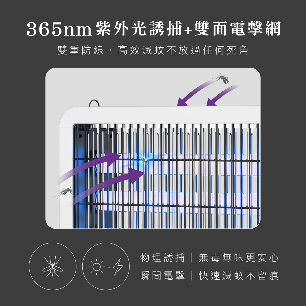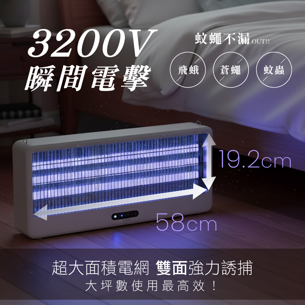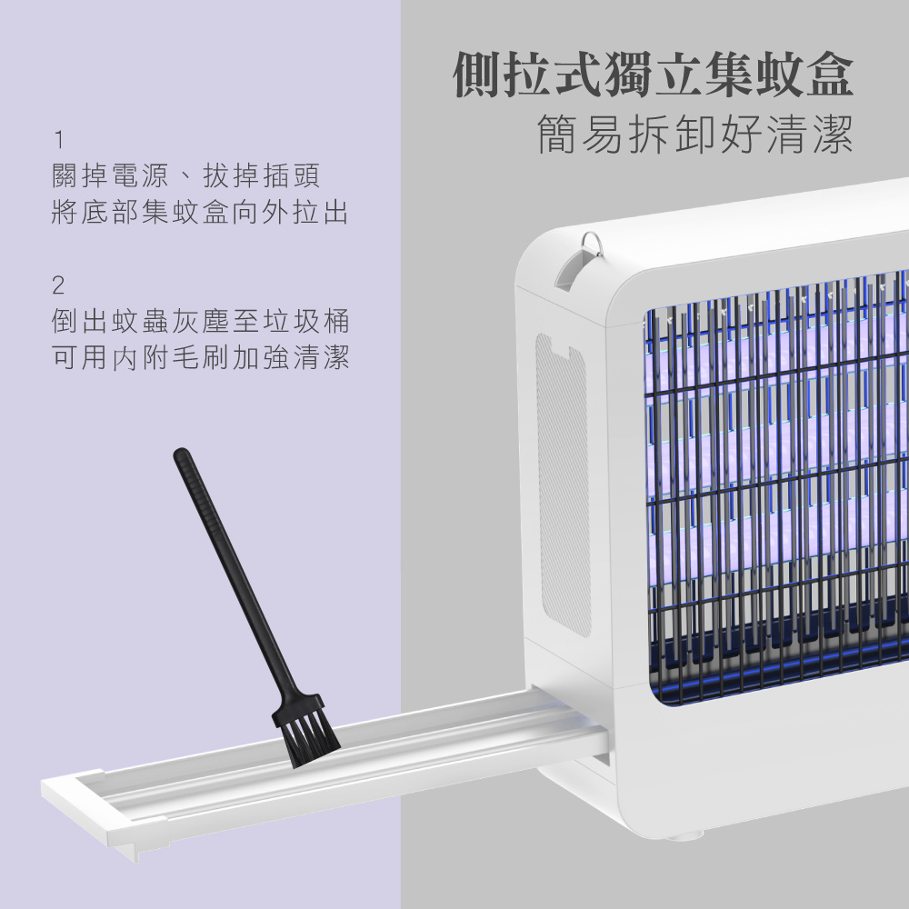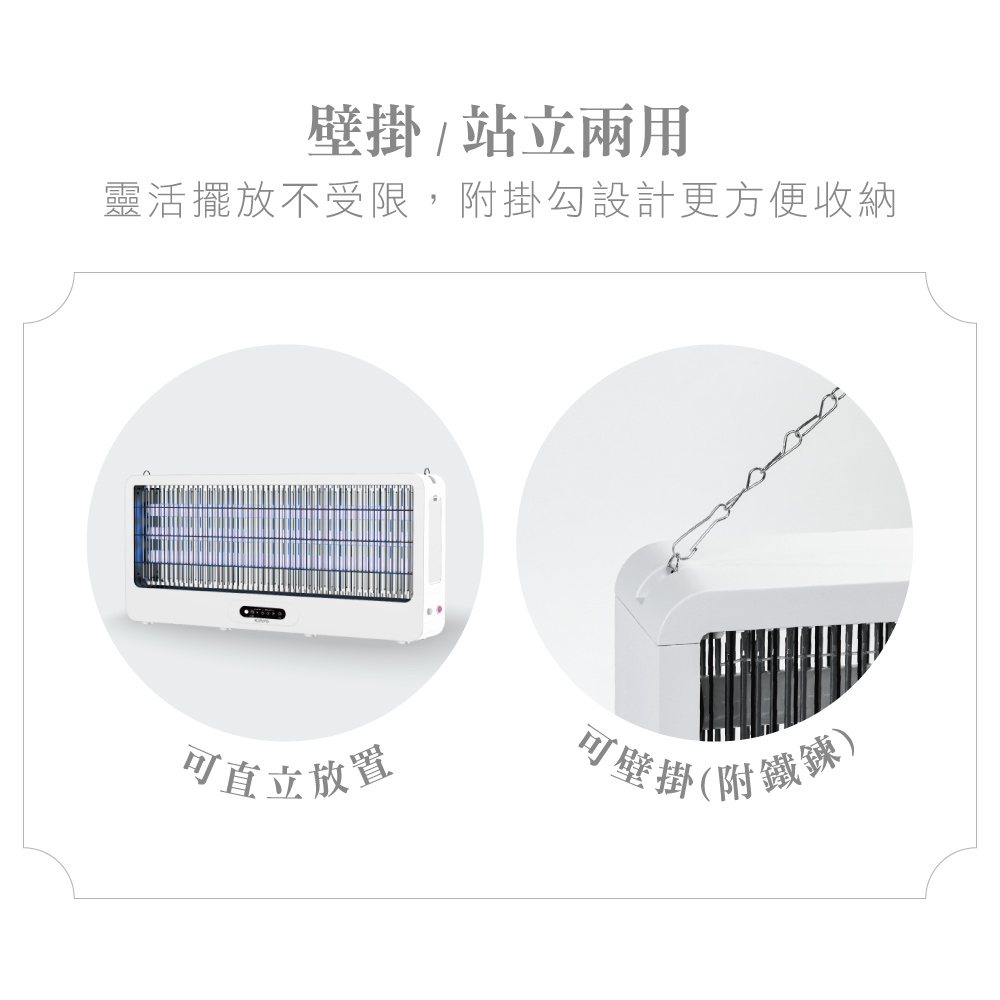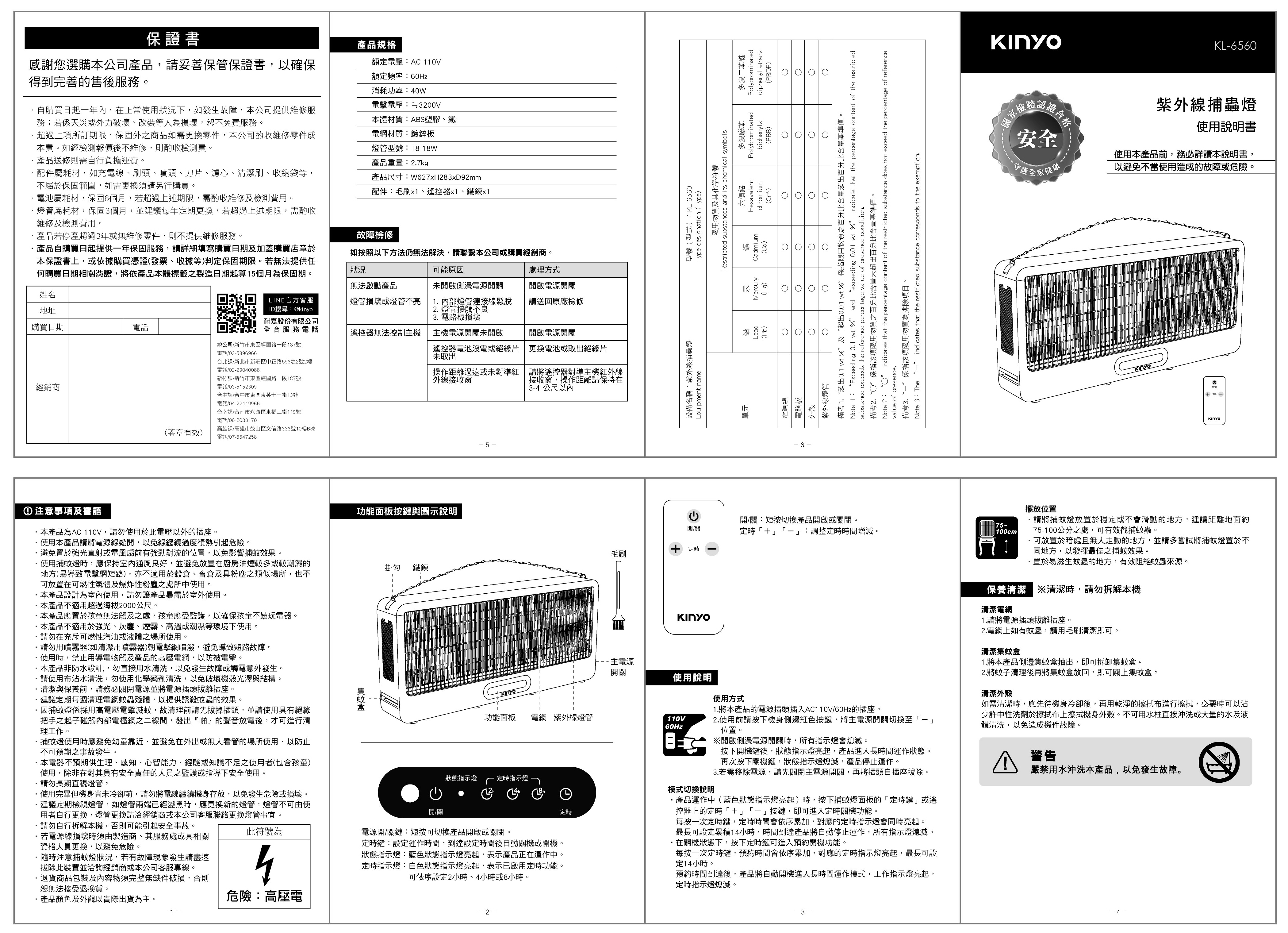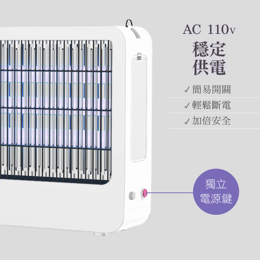 額定電壓:AC 110V 額定頻率:60Hz 消耗功率:40W 電擊電壓:≒3200V 本體材質:ABS塑膠、鐵 電網材質:鍍鋅板 燈管型號:T8 18W 配件:毛刷x1、遙控器x1、鐵鍊x1 產品尺寸: W627xH283xD92 mm 產品重量: 2700 g 包裝尺寸: W650xH286xD115 mm