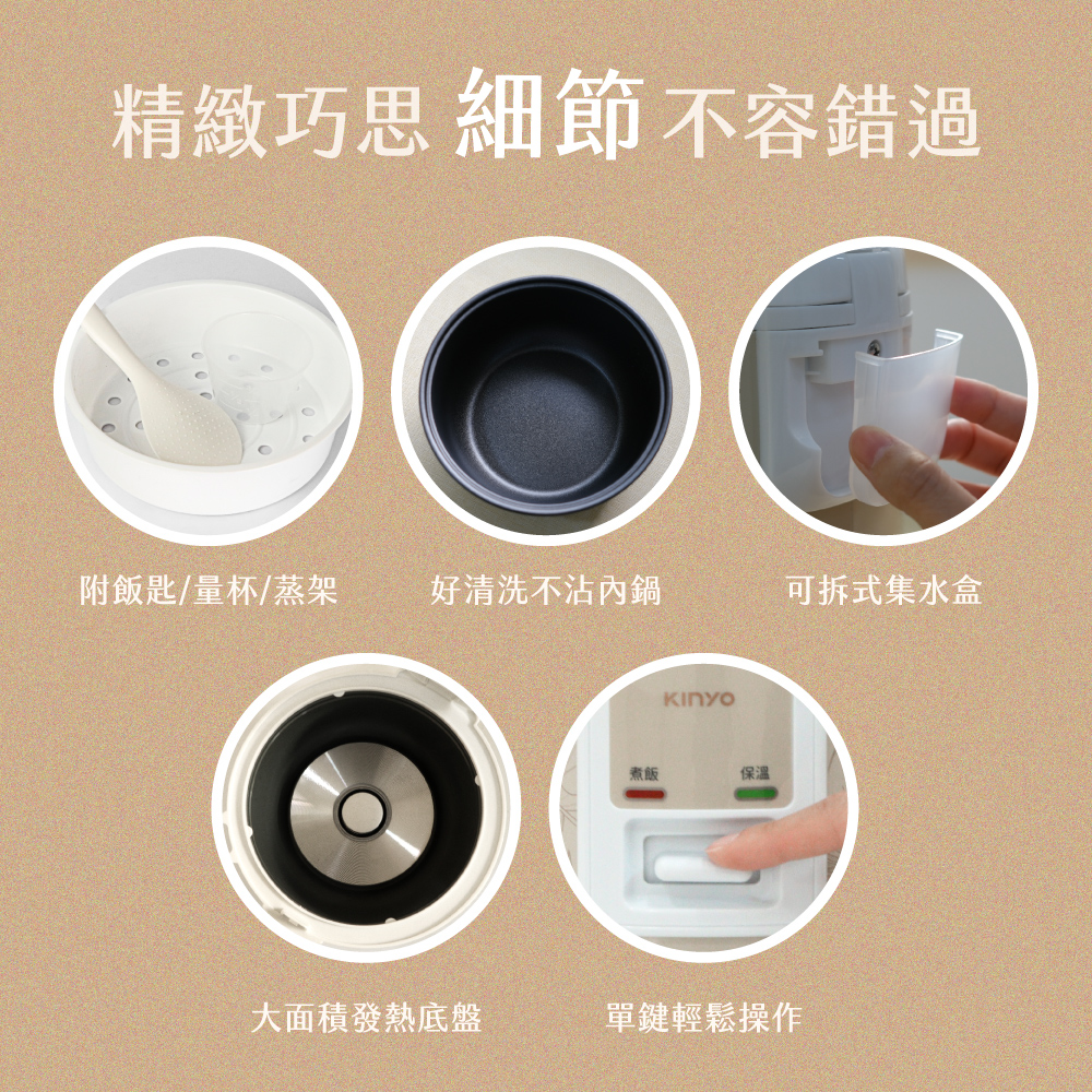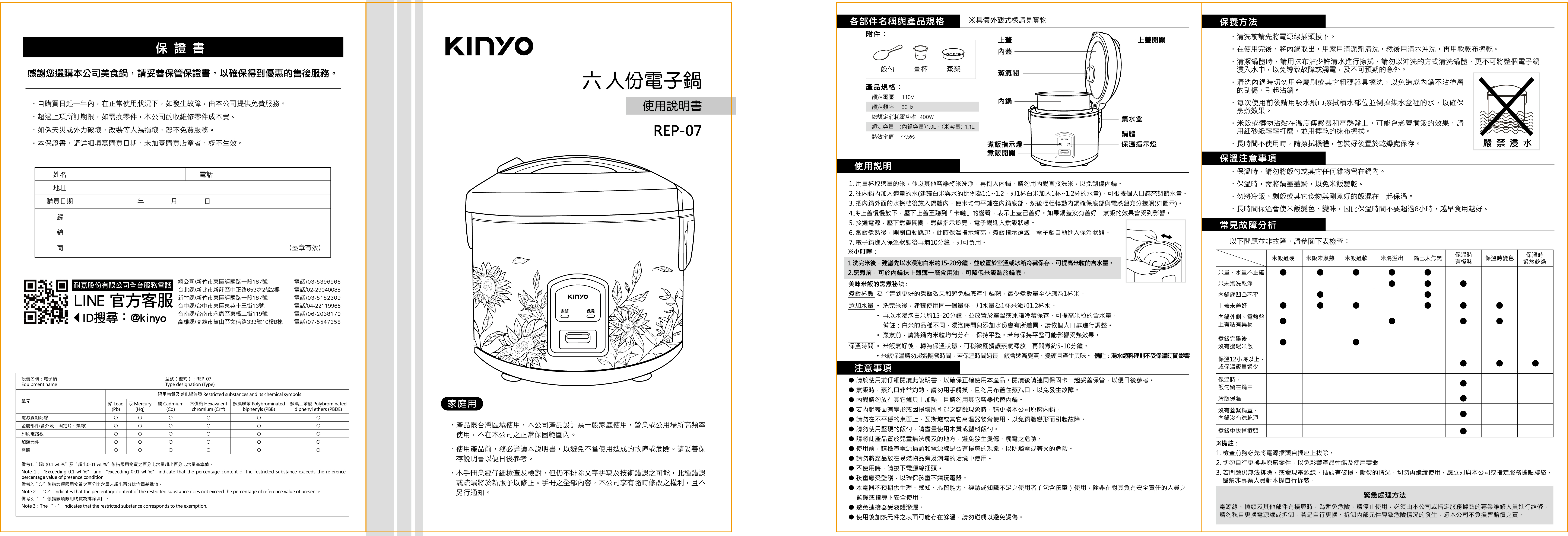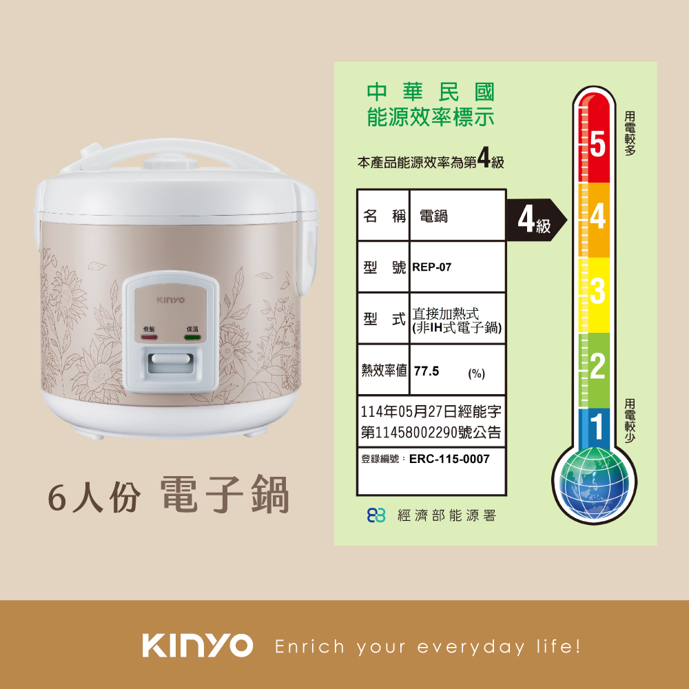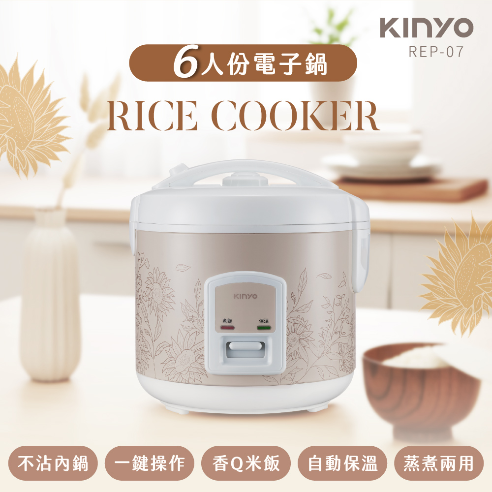 品名:電子鍋 型號:REP-07 額定電壓/頻率:110V / 60Hz 總額定消耗電功率:400W 熱效率值:77.5% 材質:PP、鋁合金、馬口鐵 額定容量:(內鍋容量)1.9L、(米容量) 1.1L 產品尺寸:W205×D225×H235mm 包裝尺寸:W243×D243×H250mm 產品重量:1550g±10% 配件:飯匙、量杯、蒸盤、電源線 商品原產地:中國