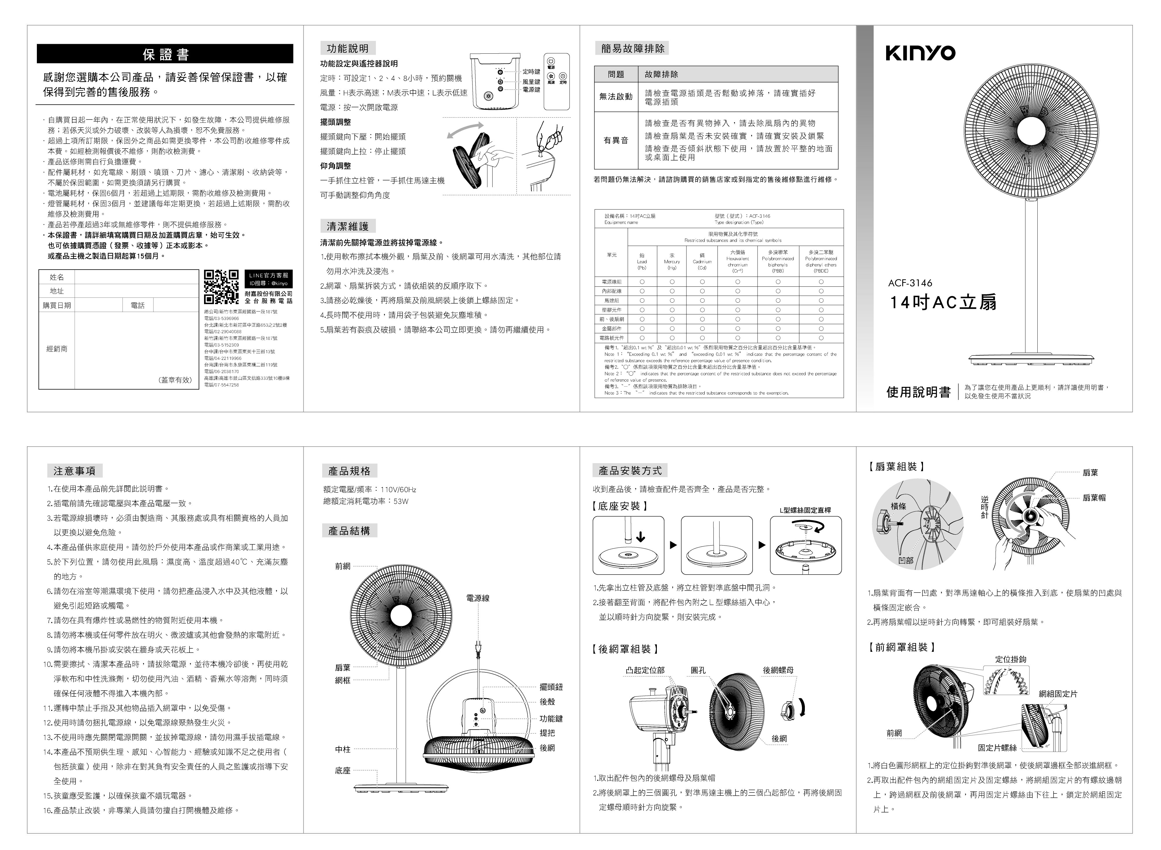 額定電壓:110V 額定頻率:60HZ 總額定消耗電功率:53W 材質:鐵、PP塑膠 電源線長:180±10CM 產品尺寸: W420xH930xD360 mm 產品重量: 4700 g 包裝尺寸: W542xH428xD230 mm