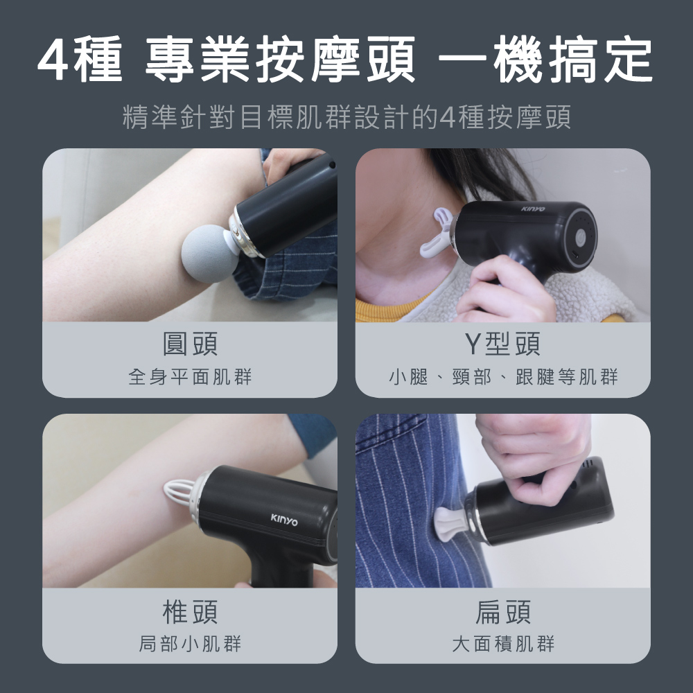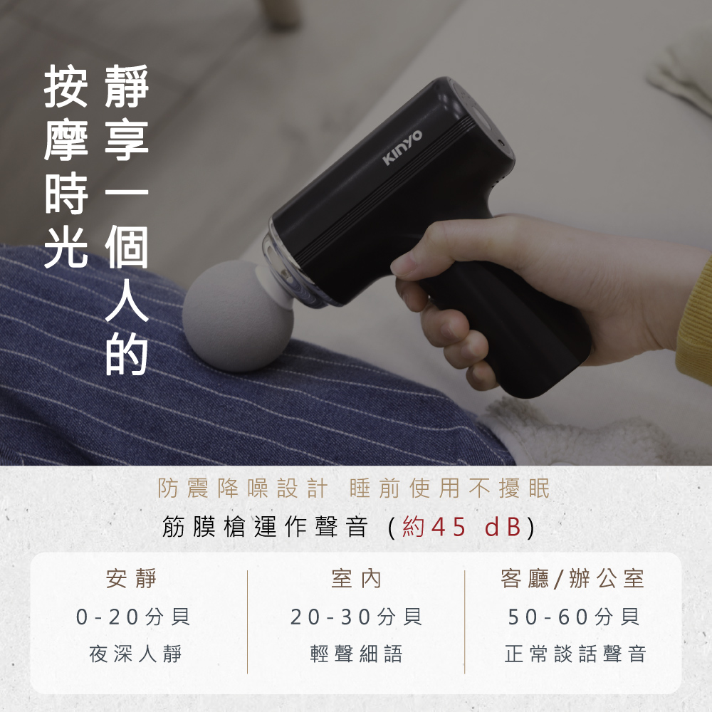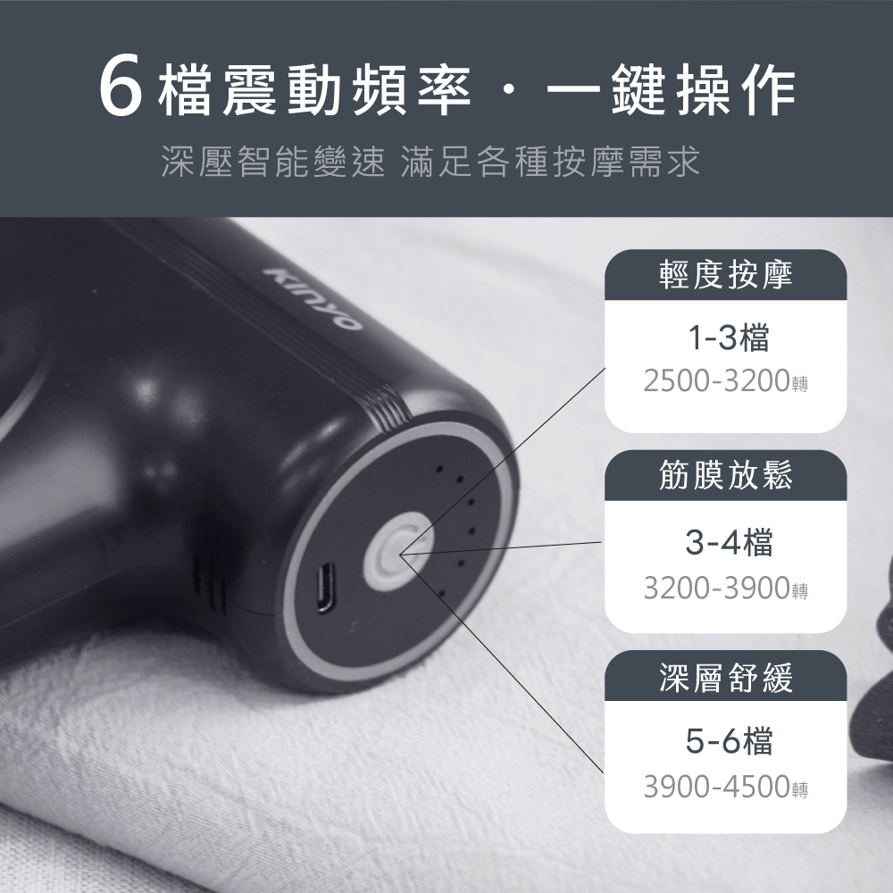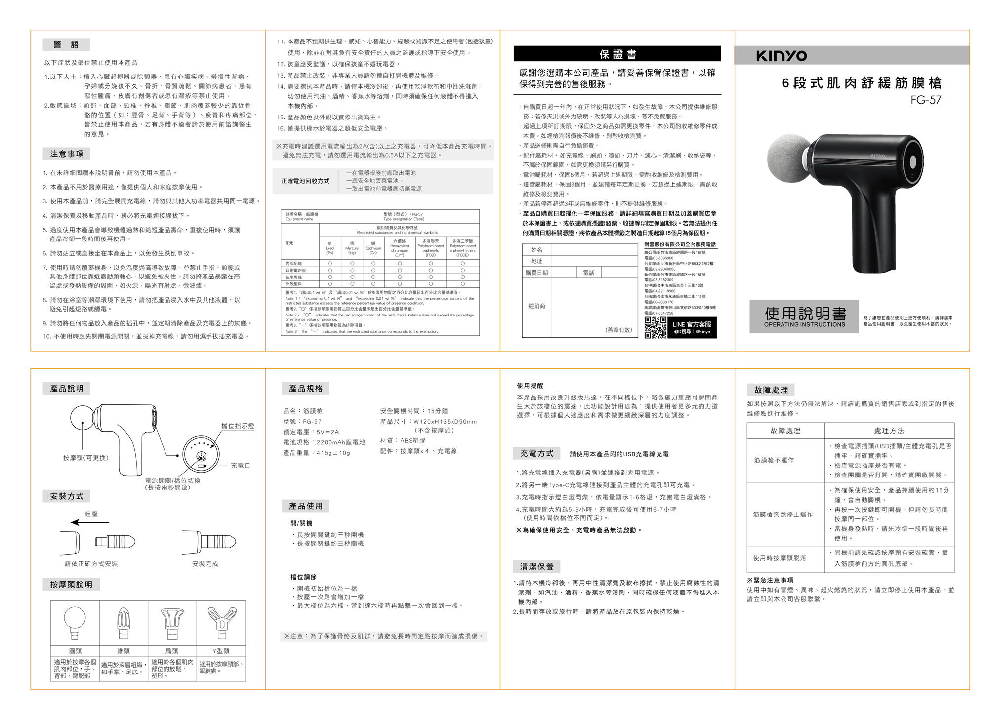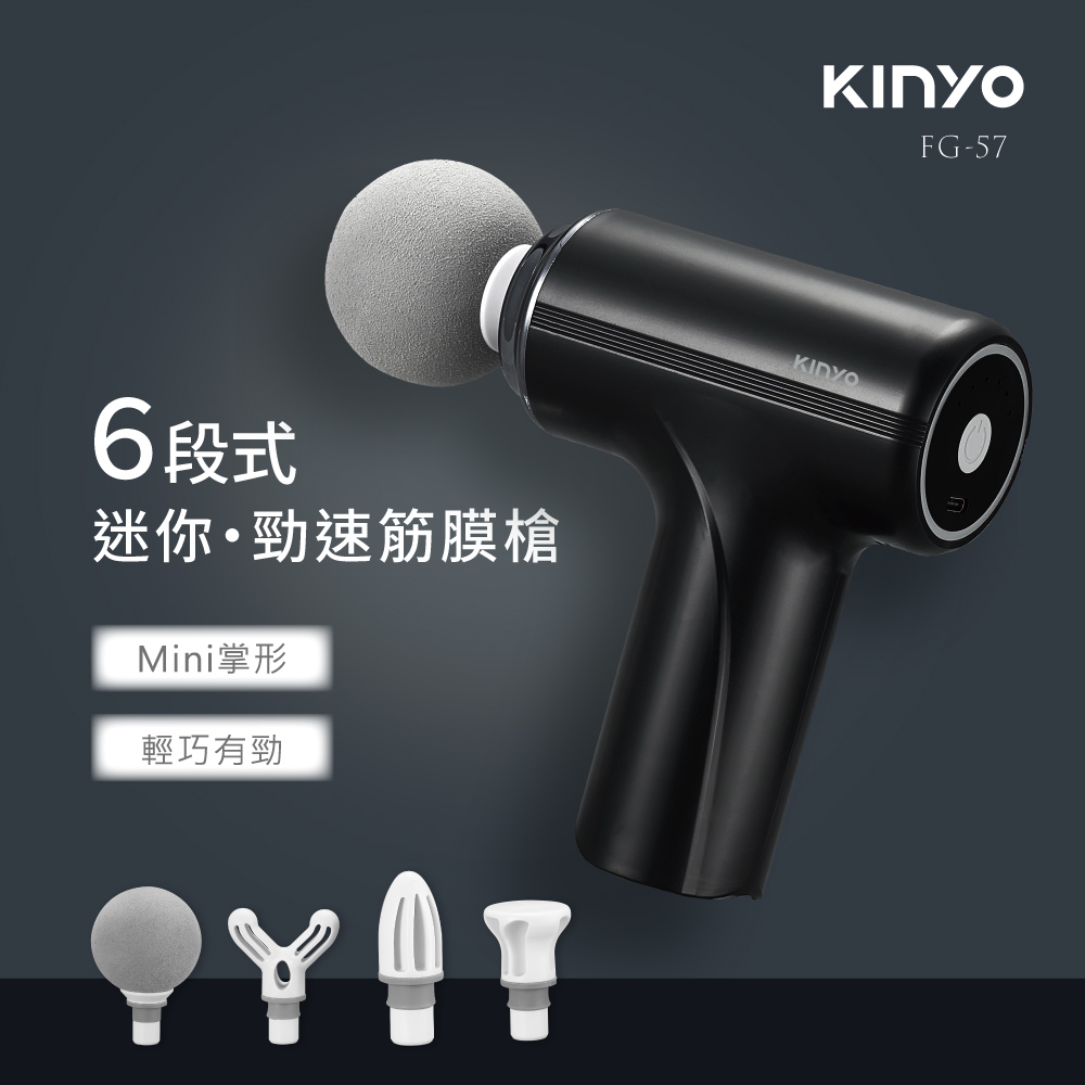 品名:筋膜槍 型號:FG-57 額定電壓電流:5V⎓2A 震動轉速:2500-4500RPM 電池規格:2200mAh鋰電池 充電時間:約5-6小時 續航時間:約6-7小時 充電指示燈:充電時白燈遞增 充飽電時燈號熄滅 使用分貝:約45dB 產品重量:415g±10g 產品尺寸:W120XH135xD50mm (不含按摩頭) 包裝尺寸:W164xH211xD61mm 材質:ABS塑膠 配件:按摩頭x4、充電線