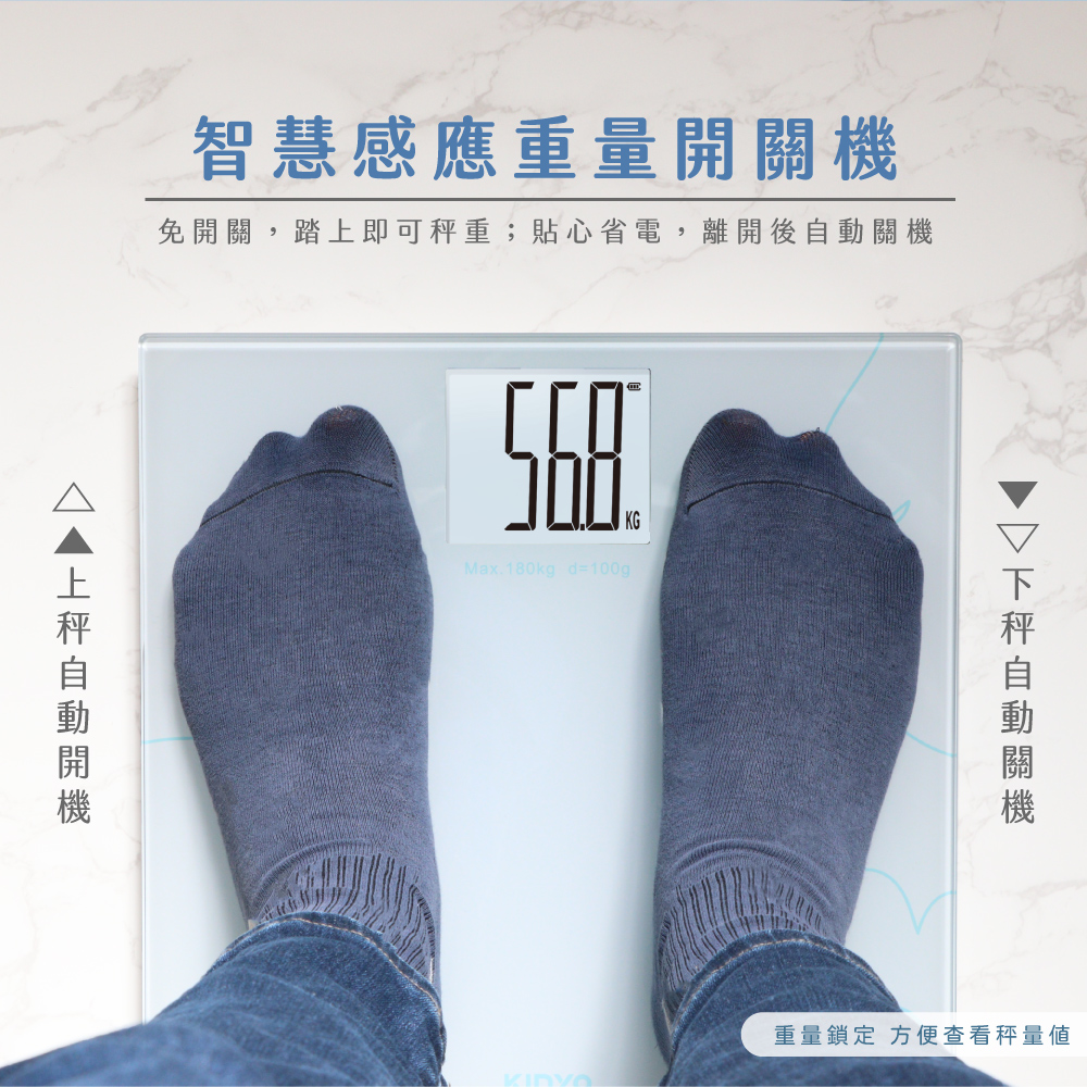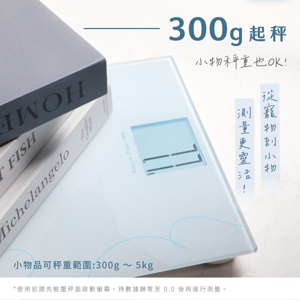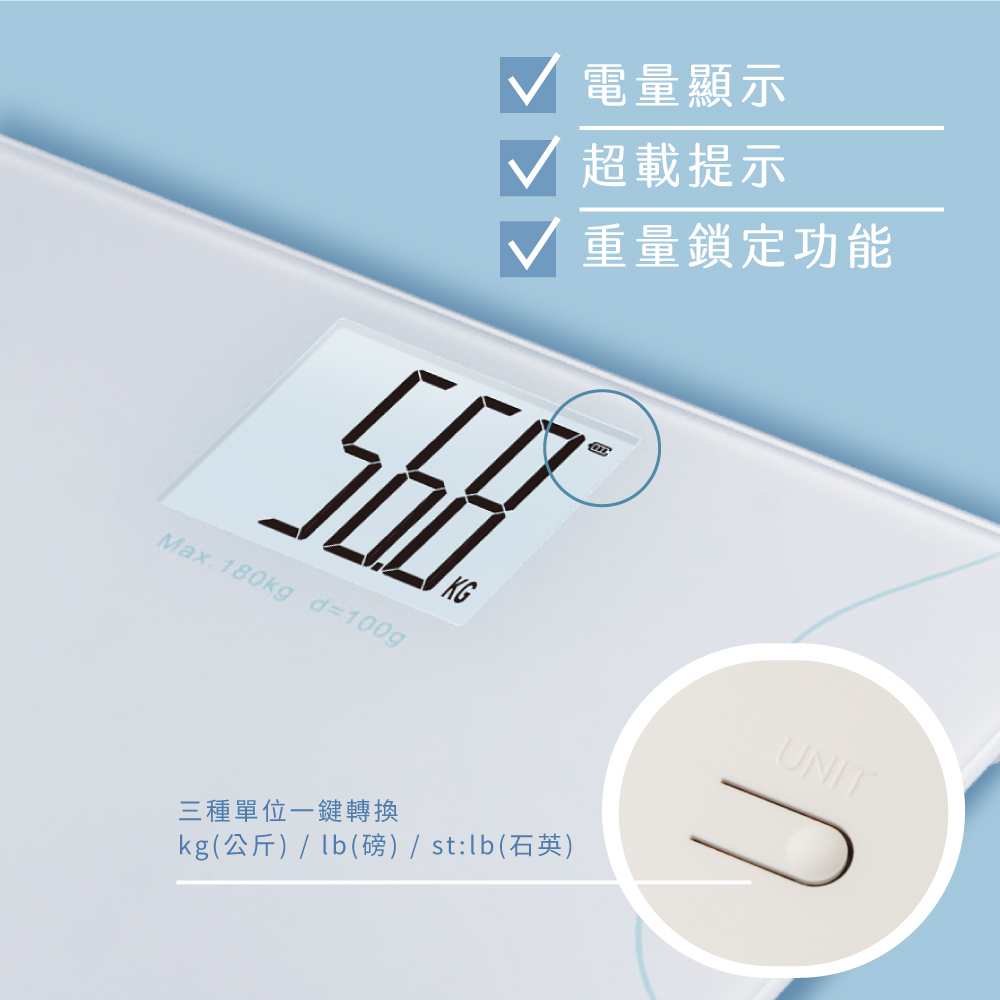 額定電壓:DC 3V 使用電源:4號(AAA)電池×2(另購) LCD顯示螢幕尺寸:70x60mm 最大負載重量:180kg/397lb/28st 最小重量感度:300g 最小單位:0.1kg 精準誤差值:50kg±0.3kg、100kg±0.4kg、150kg±0.5kg 測量單位:kg/lb/st 材質:ABS塑膠/鋼化玻璃