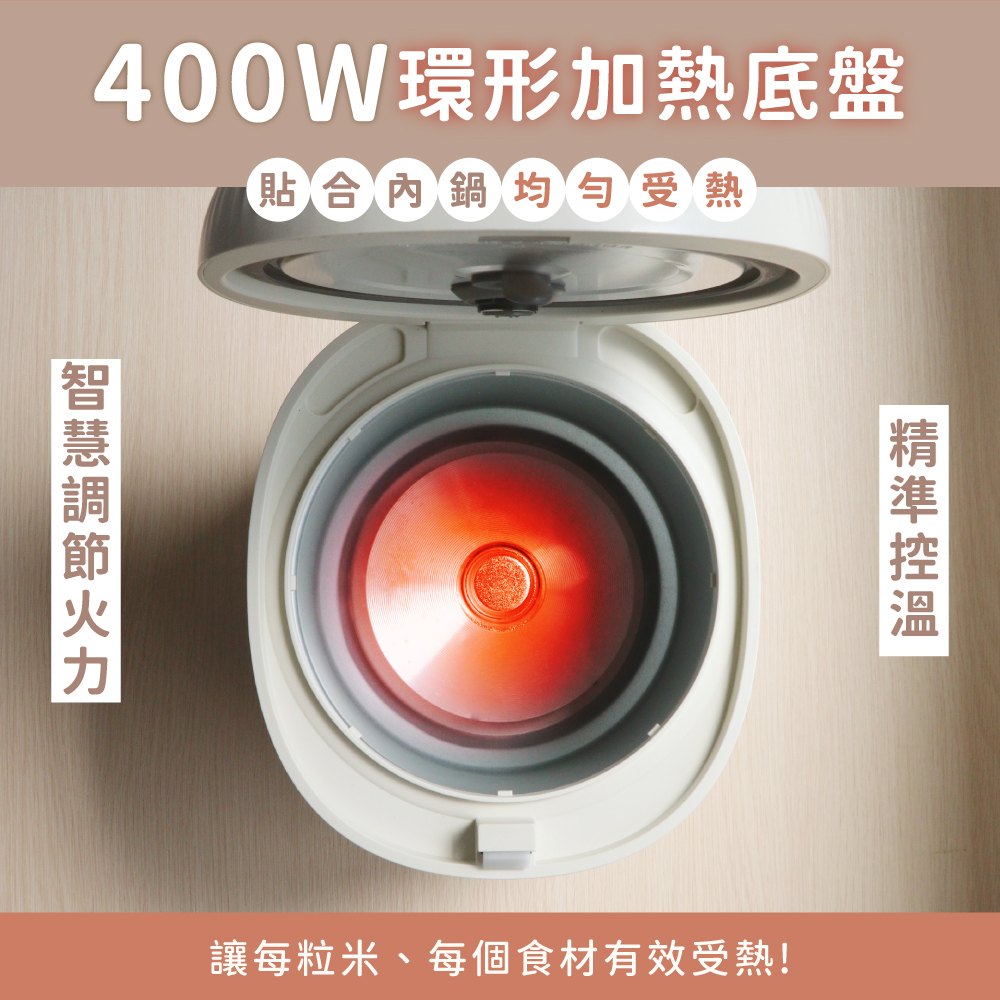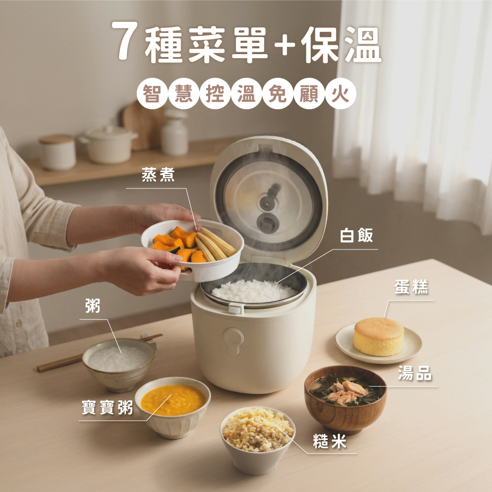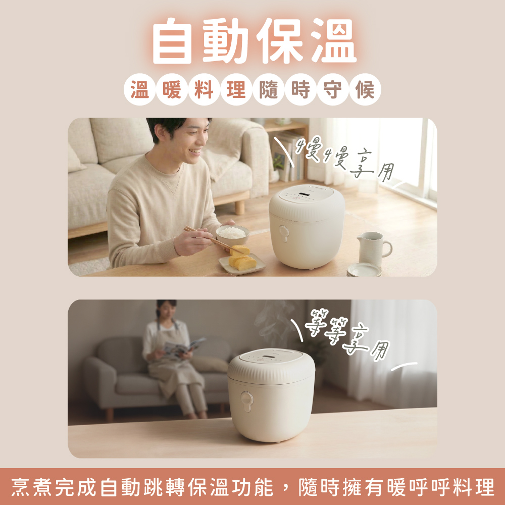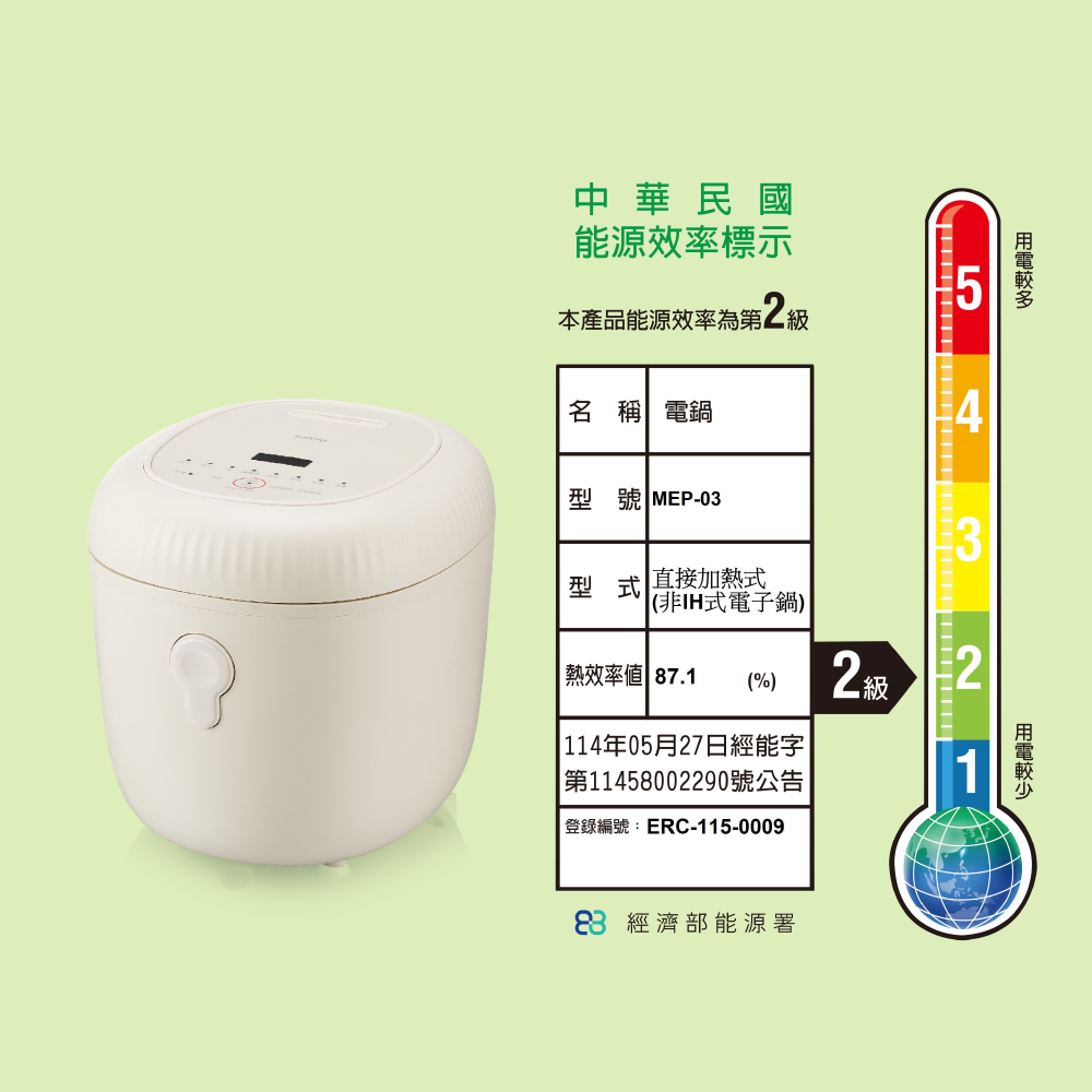 額定電壓 : 110V 額定頻率 : 60Hz 額定容量 : 2L(Max水位線1.4L) 熱效率值 : 87.1% 總額消耗電功率 : 400W 材質 : 鋁合金、PP塑膠、聚四氟乙烯不沾塗層(PTFE) 耐熱溫度 : 不沾塗層400度 產品重量 : 2kg±10% 產品尺寸 : W195xH210xD230mm 包裝尺寸 : W288xH238xD233mm 產品配件 : 電源線、飯勺、飯匙、量杯、蒸架