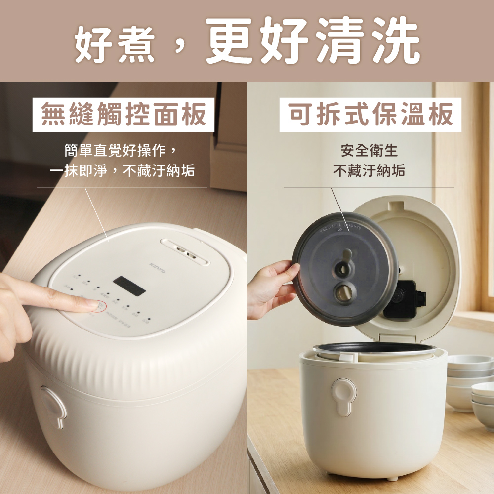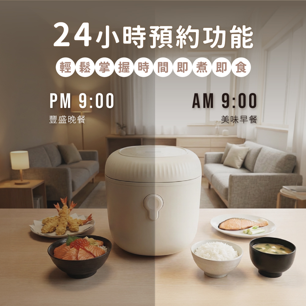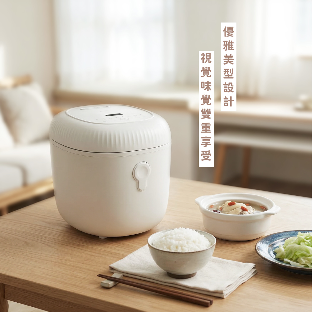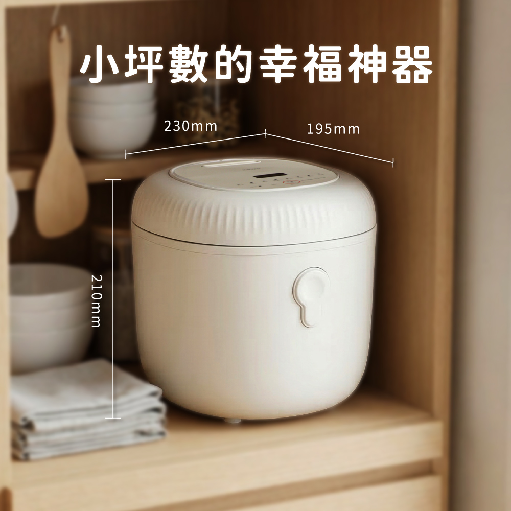 額定電壓 : 110V 額定頻率 : 60Hz 額定容量 : 2L(Max水位線1.4L) 熱效率值 : 87.1% 總額消耗電功率 : 400W 材質 : 鋁合金、PP塑膠、聚四氟乙烯不沾塗層(PTFE) 耐熱溫度 : 不沾塗層400度 產品重量 : 2kg±10% 產品尺寸 : W195xH210xD230mm 包裝尺寸 : W288xH238xD233mm 產品配件 : 電源線、飯勺、飯匙、量杯、蒸架