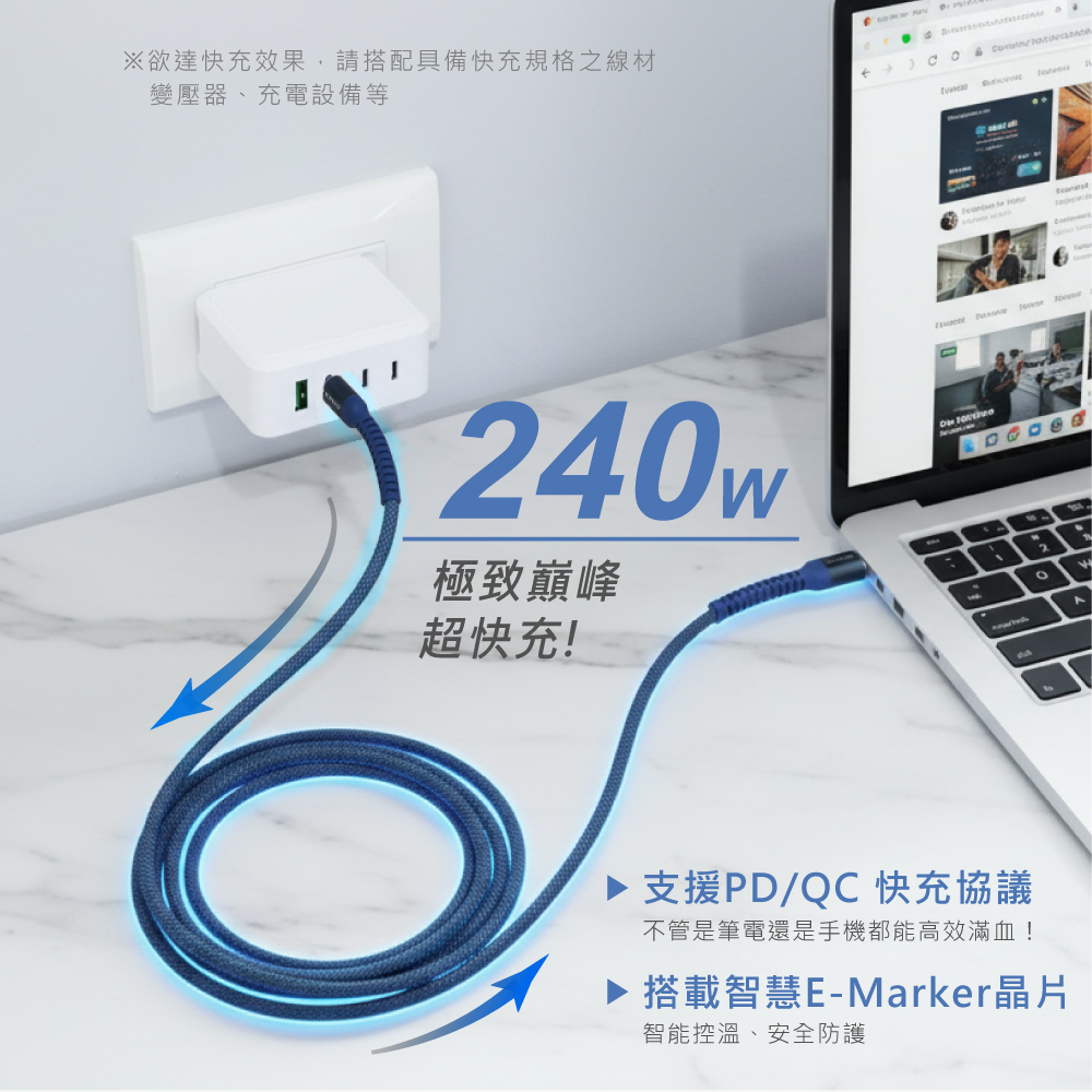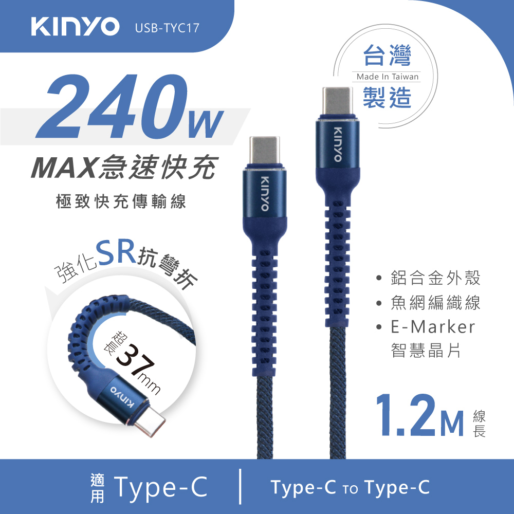 產品接頭:Type-C / Type-C 線材長度:1.2M±3% 電力傳輸:最高可達240W 資料傳輸:480Mbps 產品材質:TPE塑膠+金屬 產品重量:30g 包裝尺寸:W72xH177xD30mm 商品原產地:台灣(HQ)