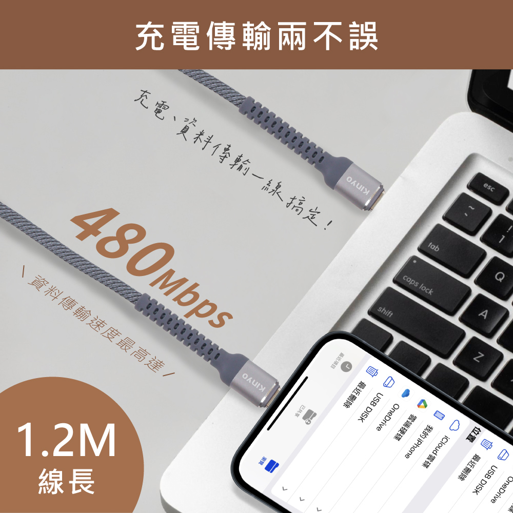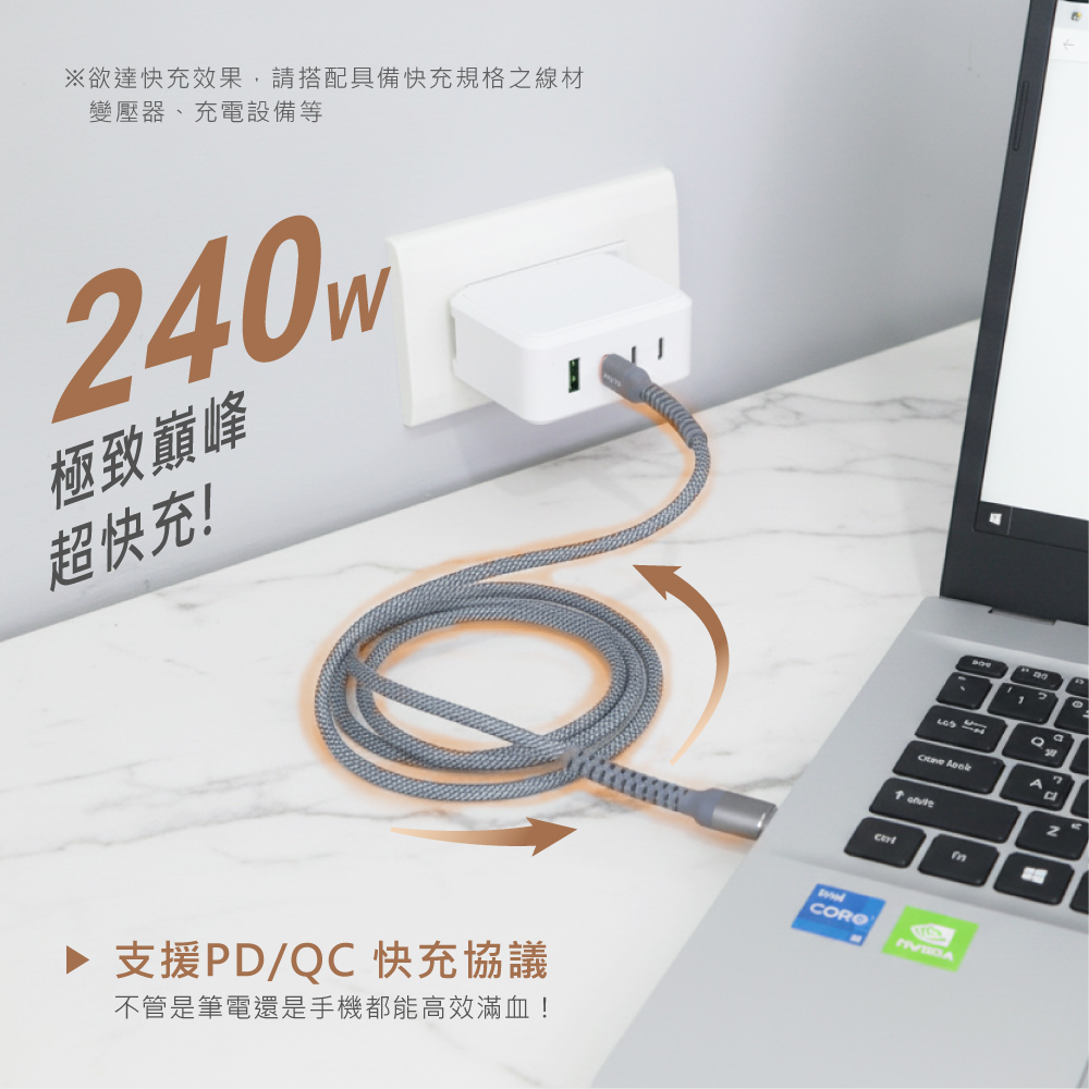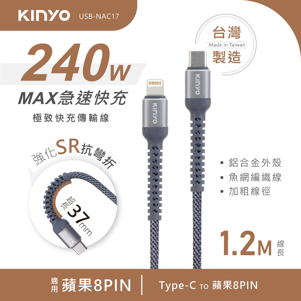 產品接頭:Type-C / 蘋果8PIN 線材長度:1.2M±3% 電力傳輸:最高可達240W 資料傳輸:480Mbps 產品材質:TPE塑膠+金屬 產品重量:30g 包裝尺寸:W72xH177xD30mm 商品原產地:台灣(HQ)