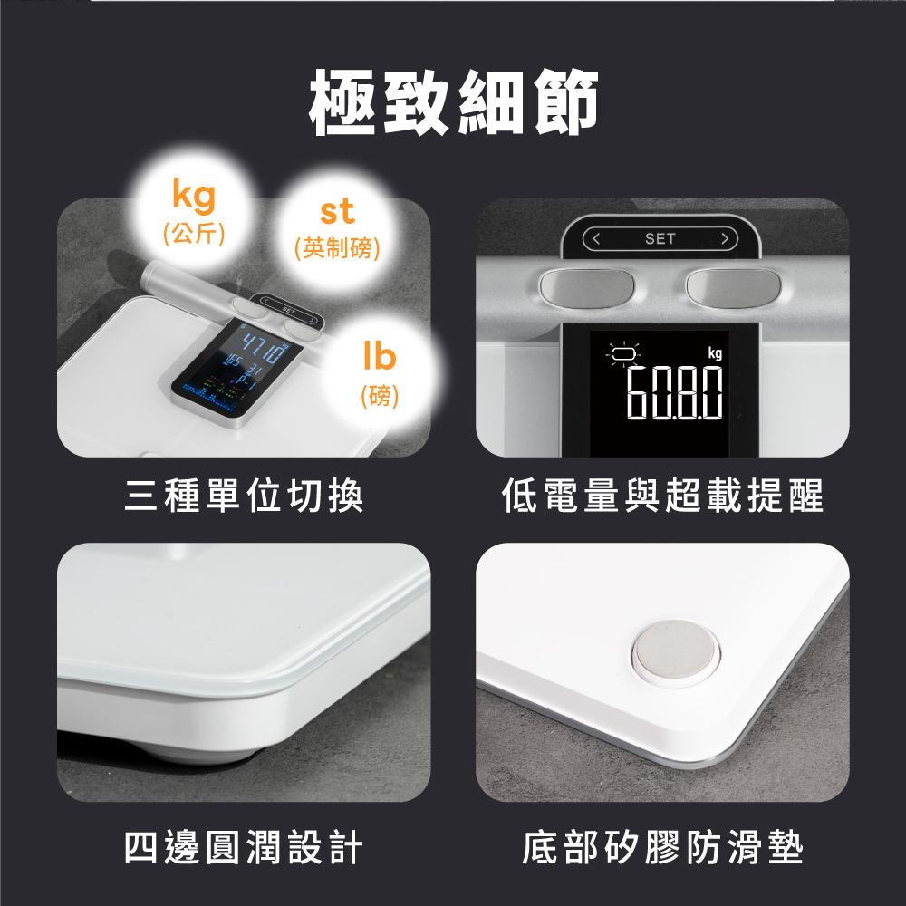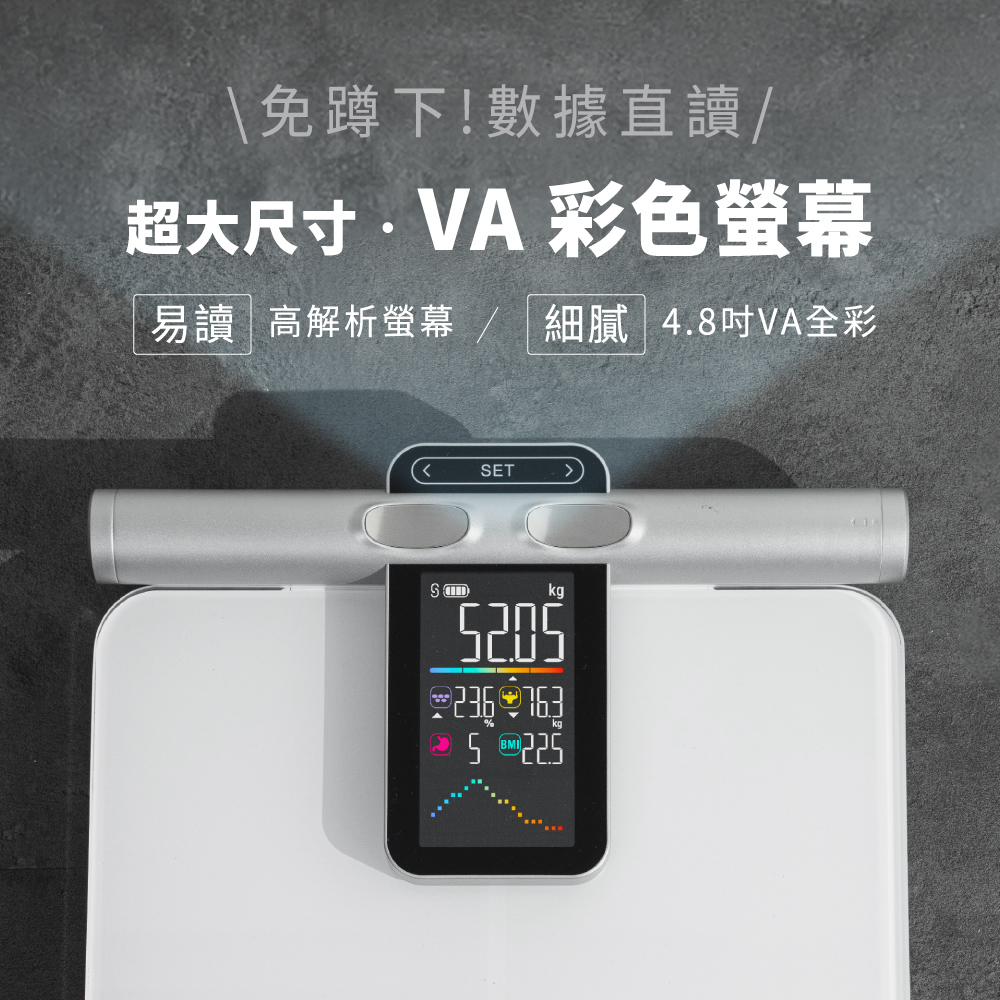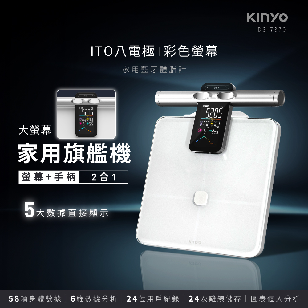 品名:體重計 型號:DS-7370 額定電壓:DC 6V 使用電源:4號(AAA)電池×4(另購) VA彩色螢幕尺寸:107x59mm 最大負載重量:180kg / 395lb 最小重量感度:5kg 最小單位:50g 測量單位:kg / lb / st:lb 誤差值 50kg±0.3kg 100kg±0.4kg 180kg±0.5kg 材質:鋼化玻璃 / HIPS塑膠 產品重量:2.4kg 產品尺寸:W358xD310xH41mm 包裝尺寸:W380XD429XH80m 商品原產地:中國