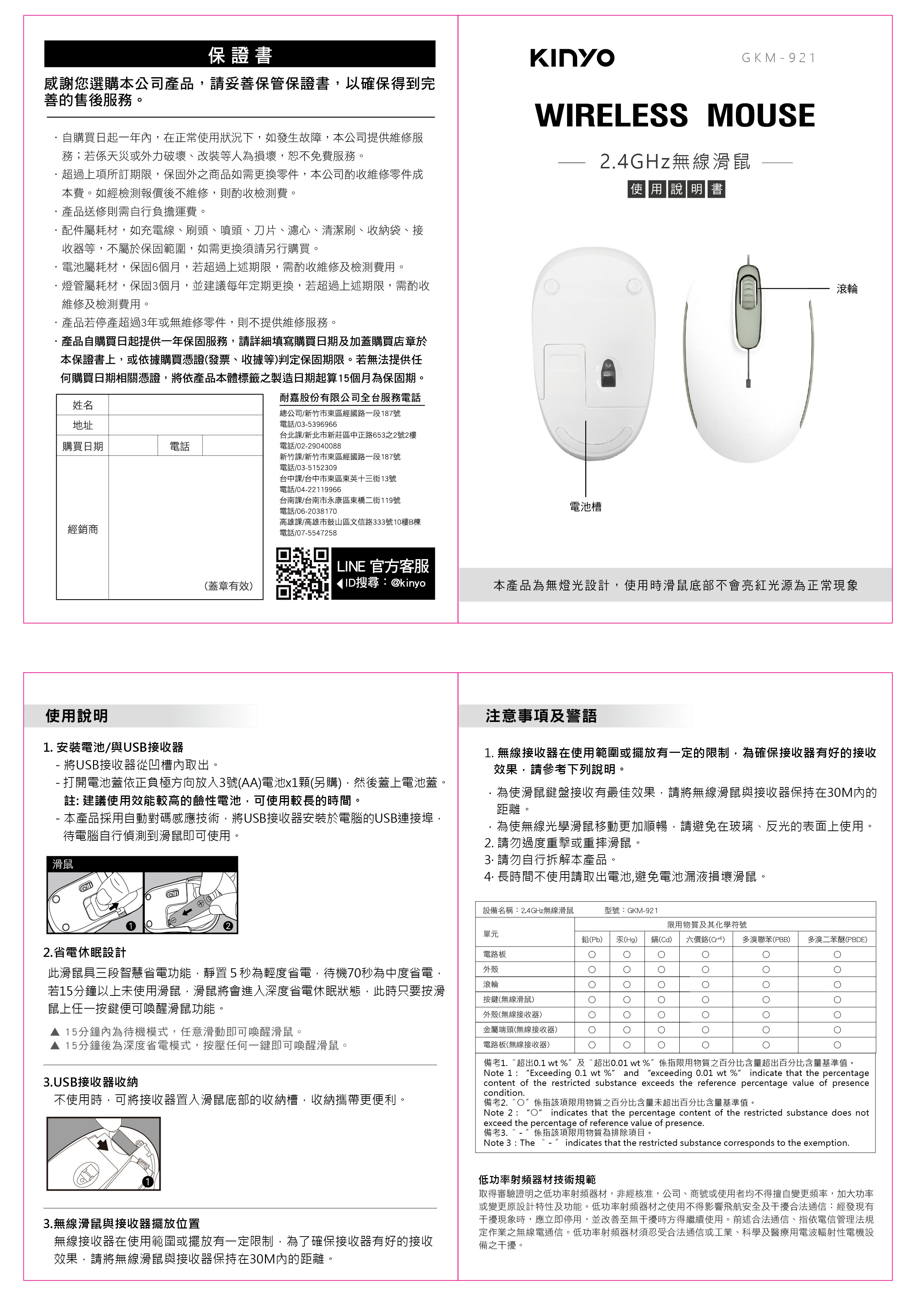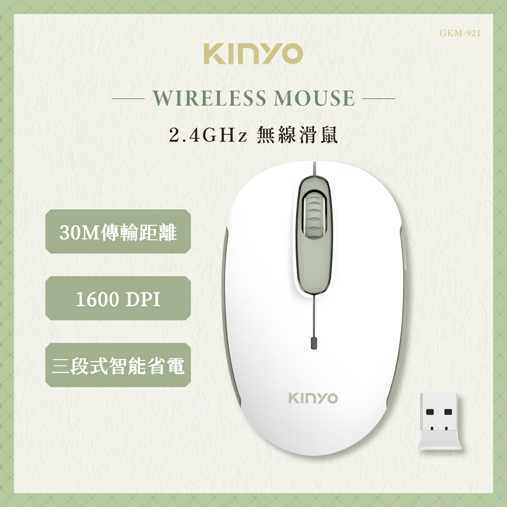 品名:2.4GHz無線滑鼠 型號:GKM-921 額定電壓:DC 1.5V 使用電源:3號AA電池×1(另購) 傳輸頻率:2.4GHz 額定頻率:24MHz 額定輸入電流:10-15mA 解析度:1600DPI 工作距離:30M(無任何障礙環境) 按鍵數:3鍵(含滾輪) 接收器介面:USB 產品材質:ABS塑膠、金屬 產品尺寸:W60×H38×D100mm 包裝尺寸:W135×H206×D86mm 產品重量:60g 商品原產地:中國(LJ)